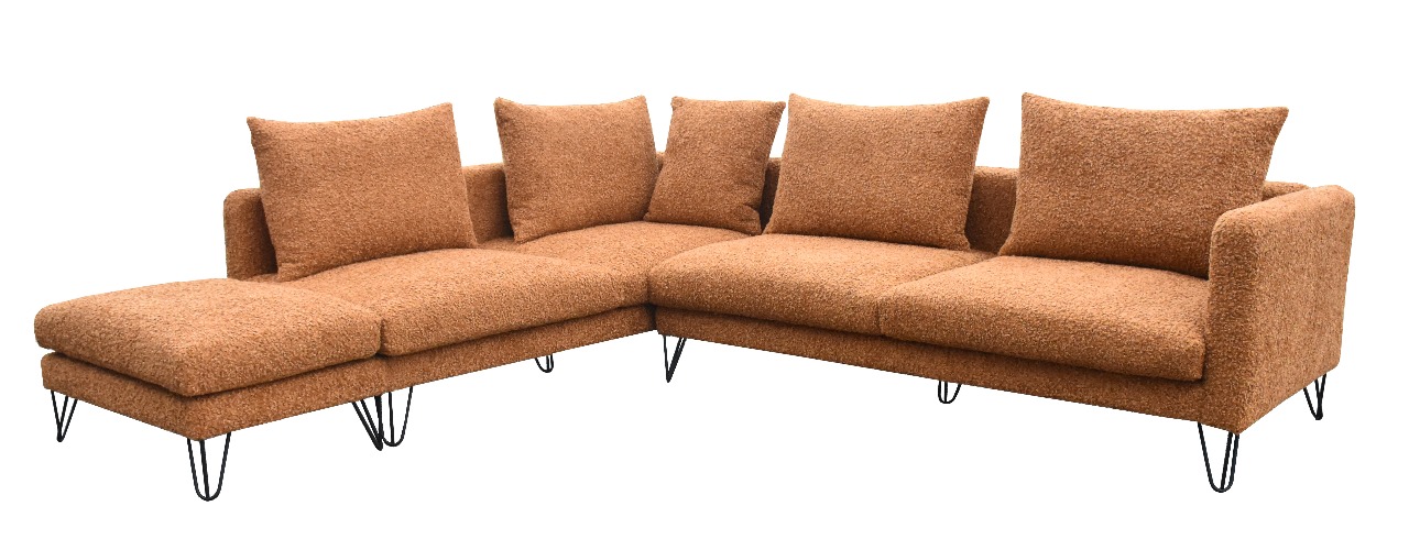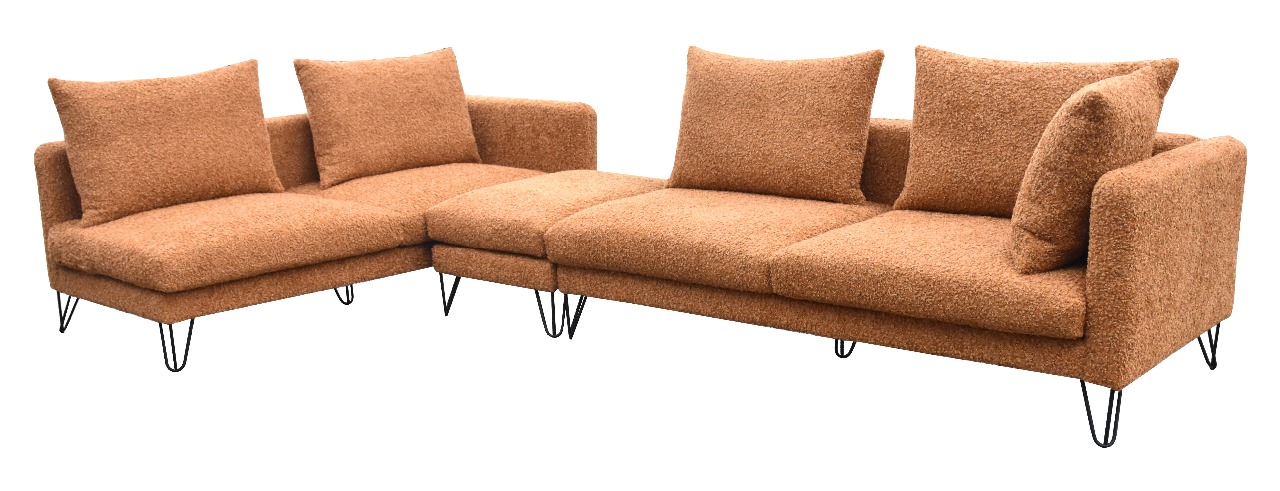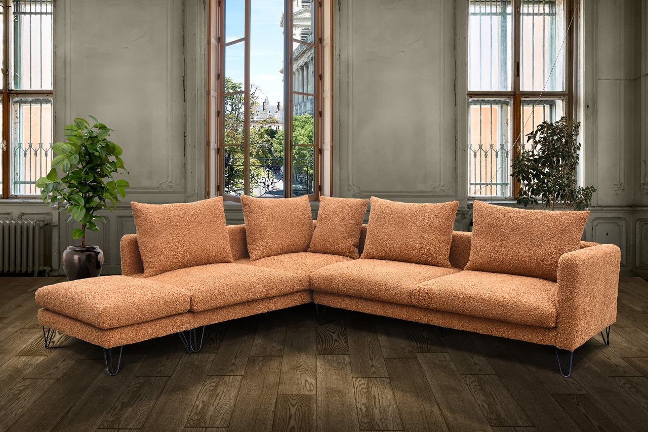 Γωνιακός καναπές σε μίνιμαλ ύφος, με λεπτά μπράτσα.