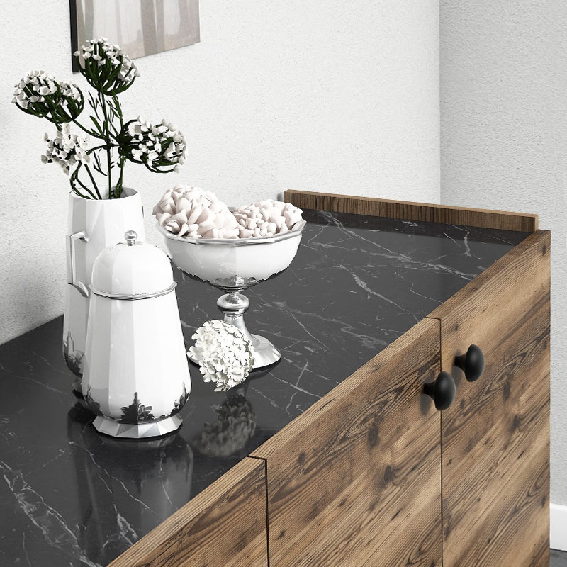 • Η επιφάνεια του μπουφέ είναι σε χρώμα μαύρο εφέ μαρμάρου.