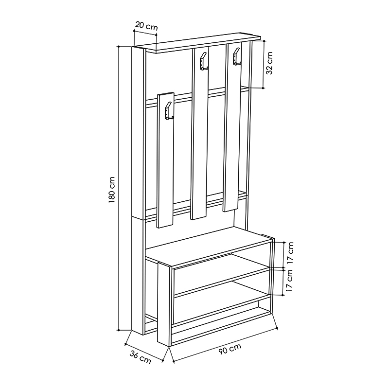 • Φέρει 2 ράφια στο κάτω μέρος και τρεις κρεμάστρες.