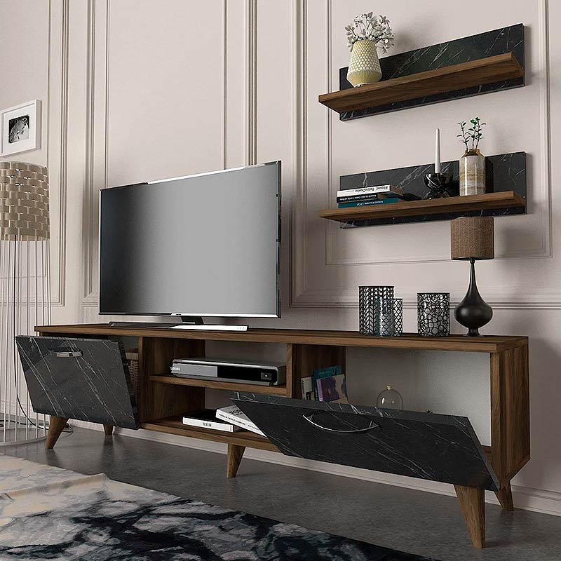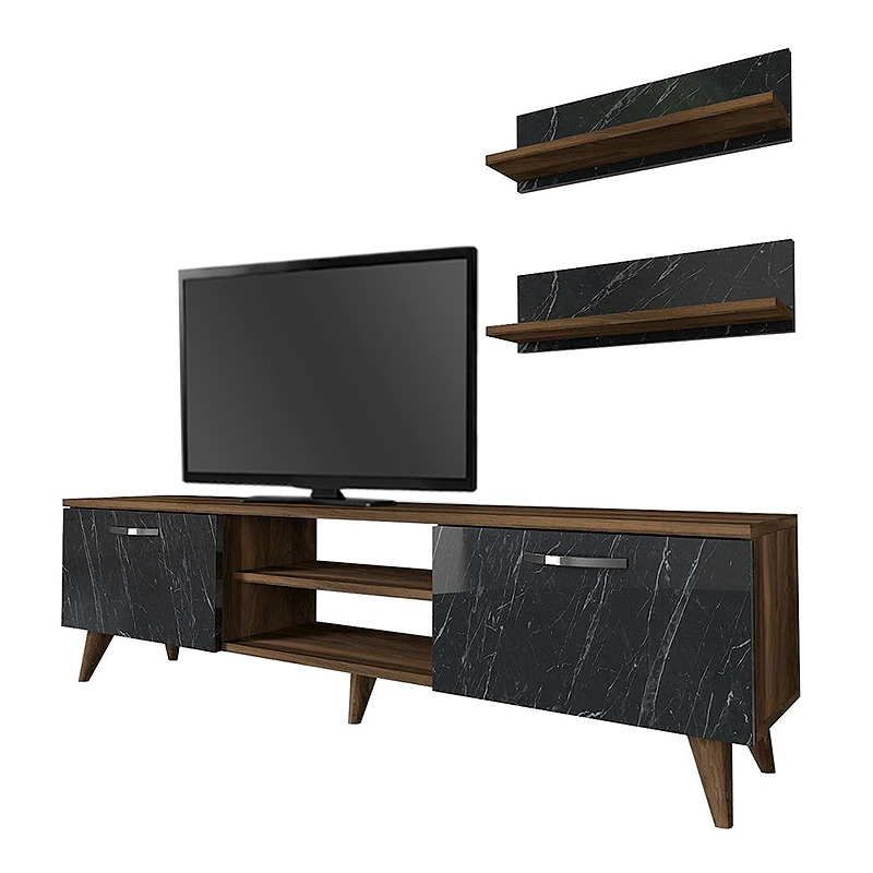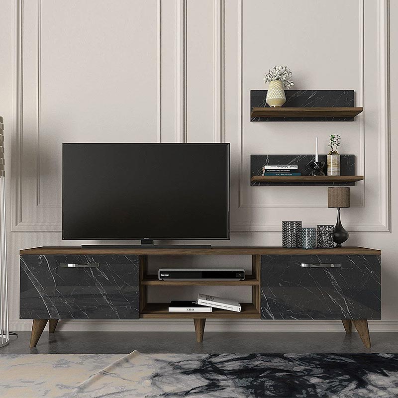 Έπιπλο τηλεόρασης Colin Megapap από μελαμίνη χρώμα καρυδί – μαύρο εφέ μαρμάρου 150×29,5×40,6εκ.