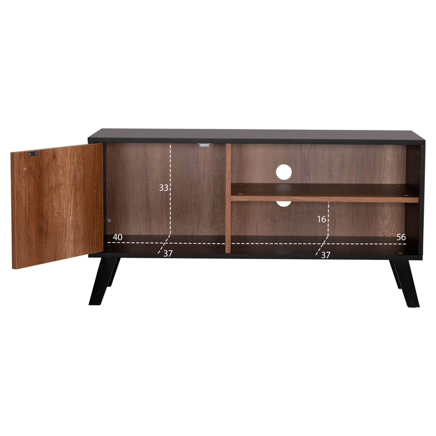 Το KRUDEN είναι ένα μοντέρνο και λειτουργικό έπιπλο τηλεόρασης, που θα ομορφύνει το σαλόνι σας! Είναι σχετικά μικρό και διαθέτει 1 ντουλάπι κι έναν ανοιχτό χώρο τοποθέτησης αντικειμένων με ράφι. Τα χρώματα του επίπλου είναι το μαύρο που είναι και το χρώμα της επιφάνειας, και το φυσικό του ξύλου που είναι το χρώμα στο ντουλάπι και στο ράφι. Πρόκειται για μια κομψή και βολική πρόταση για σαλόνια χωρίς ιδιαίτερα μεγάλο χώρο!