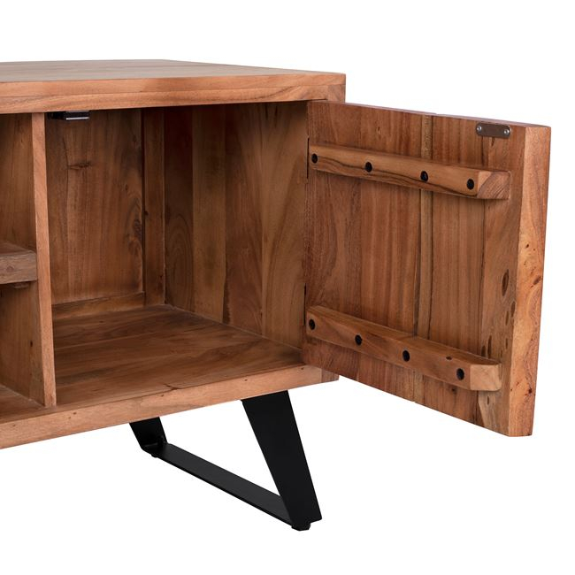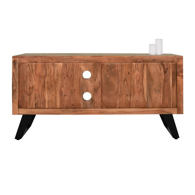 Έπιπλο τηλεόρασης από μασίφ ξύλο Ακακίας σε φυσική απόχρωση και μεταλλικά πόδια σε μαύρο χρώμα.
