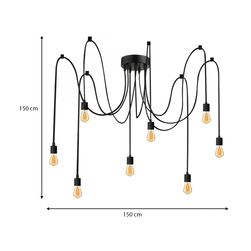 Διαθέτει μαύρη μεταλλική βάση οροφής, από την οποία κρέμονται 8 μαύρα μακριά καλώδια που καταλήγουν σε 8 μαύρα ντουί. Τα καλώδια μπορείτε να τα τοποθετήσετε όπως επιθυμείτε.