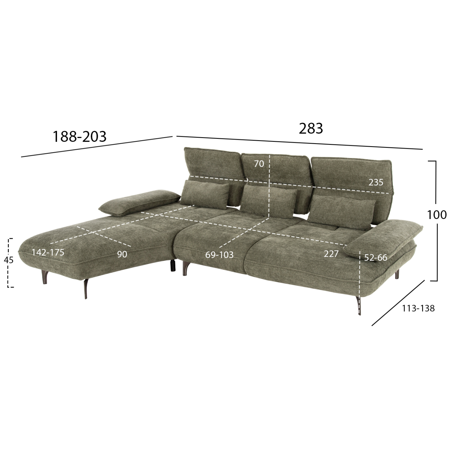 Διαστάσεις καθίσματος: 227×69-103-142-175×90 εκ.