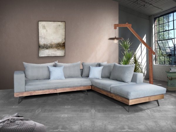 Γωνιακός καναπές με ξύλινα στοιχεία στη βάση και το μπράτσο.