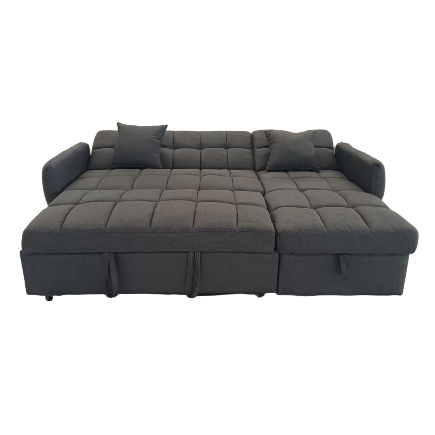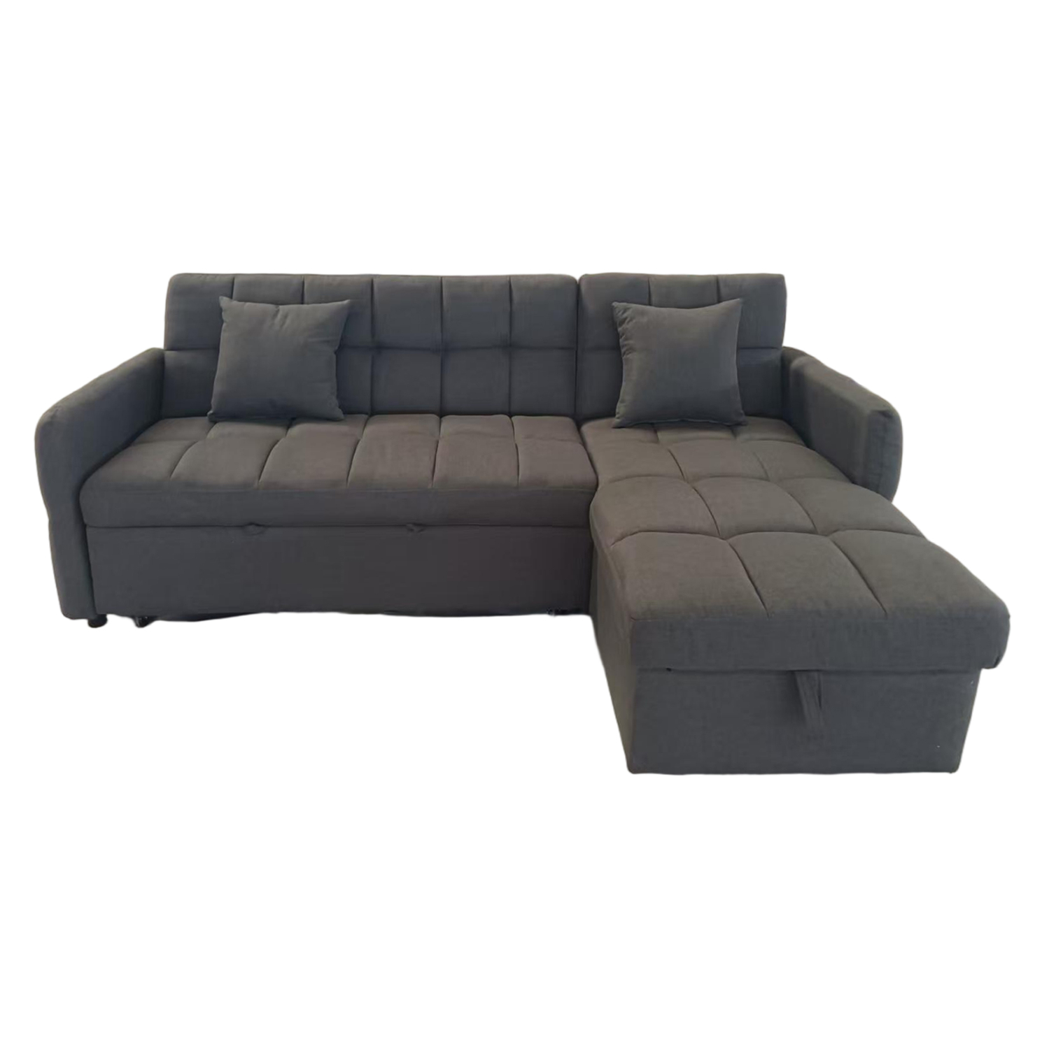 Επενδεδυμένος με γκρι ύφασμα και καπιτονέ μοτίβο, προσθέτει κομψότητα και ζεστή αισθητική στο περιβάλλον. Ο μηχανισμός μετατροπής σε κρεβάτι είναι απλός και ομαλός, προσφέροντας άνετη επιφάνεια ύπνου.