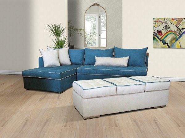 Γωνιακός καναπές με δυνατότητα τοποθέτησης της γωνίας αριστερά ή δεξιά, εύκολα και γρήγορα, με μια απλή μετακίνηση του ταμπουρέ. Διακοσμητικές λεπτομέρειες με ρέλια.
