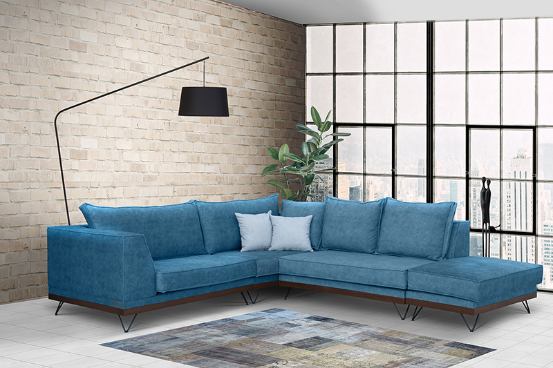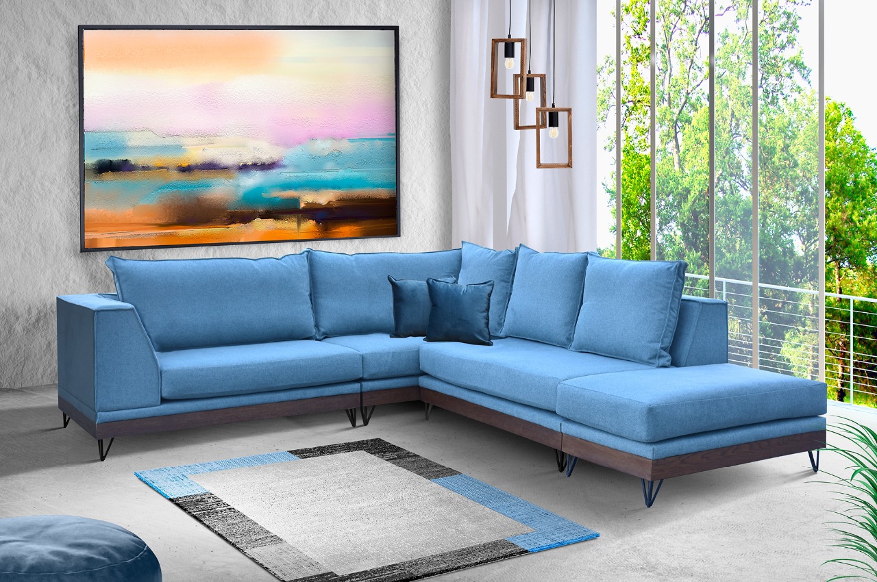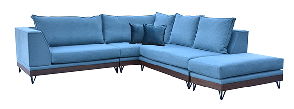 Σύστημα καναπέ αποτελούμενο από τέσσερα (4) τεμάχια, με δυνατότητα τοποθέτησης της γωνίας αριστερά ή δεξιά, εύκολα και γρήγορα, με μια απλή μετακίνηση των τεμαχίων. Ιδιαίτερο στοιχείο του η βάση από ξύλο και ύφασμα που προσδίδει μοντέρνο στιλ. Με ιδιαίτερη ραφή με εξώγαζα στο σκελετό και τα μαξιλάρια.