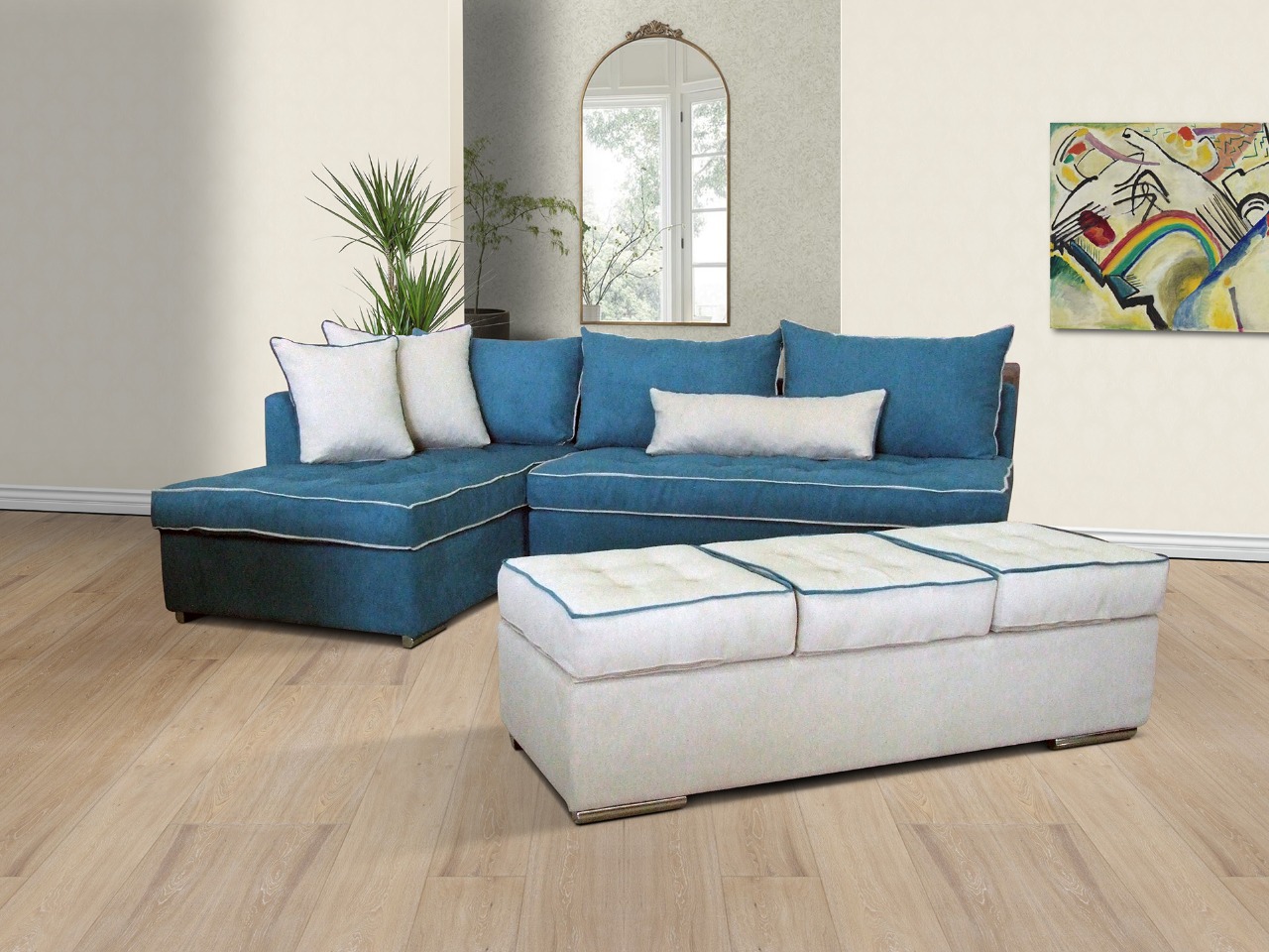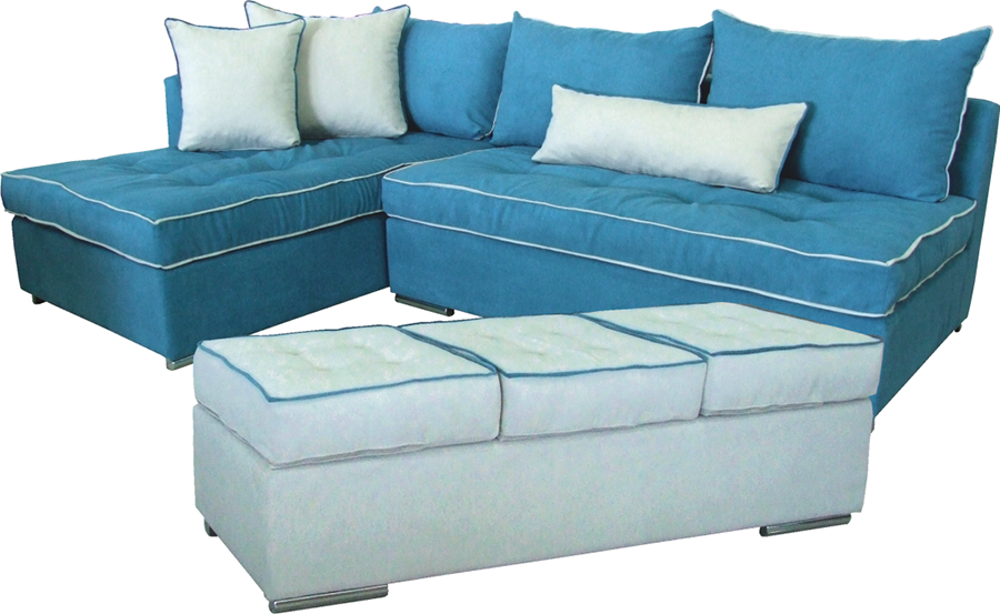 Γωνιακός καναπές με μεγάλο ανεξάρτητο σκαμπό. Μαξιλάρια με διακοσμητικά ρέλια.