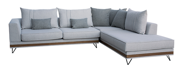 Γωνιακός καναπές με ιδιαίτερη και πρωτότυπη βάση που αποτελείται από ύφασμα, ξύλο και ύφασμα. Ο καναπές φέρει διακοσμητικές λεπτομέρειες με εξώγαζα σε διάφορα σημεία στα μαξιλάρια του καθίσματος και της πλάτης.