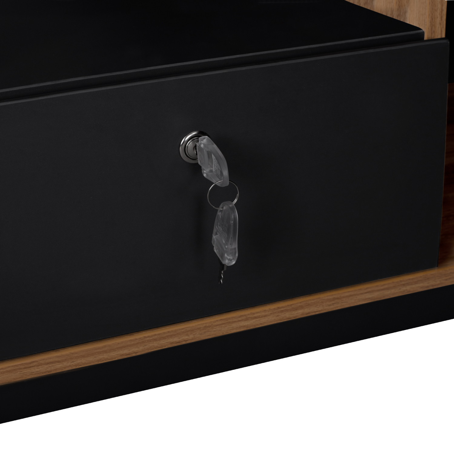 Διαθέτει ένα ντουλάπι, ένα συρτάρι με κλειδαριά και τέσσερις ανοιχτούς αποθηκευτικούς χώρους.