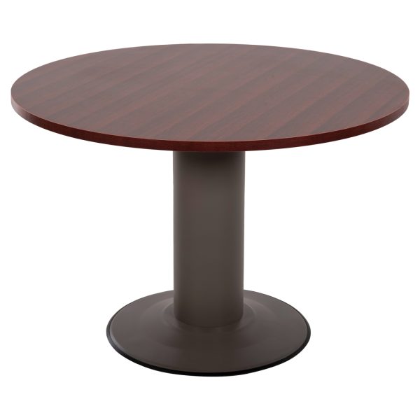 Επαγγελματικό γραφείο συνεδριάσεων με στρόγγυλη επιφάνεια, κατασκευασμένο από ανθεκτική μελαμίνη σε απόχρωση οξιάς και μεταλλική βάση σε γκρι απόχρωση.