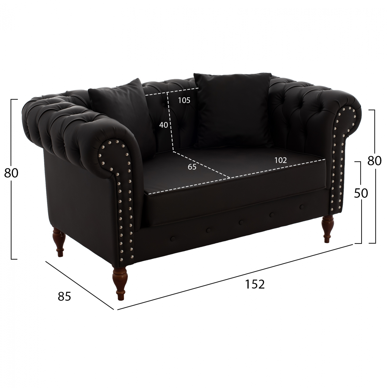 Ο διθέσιος καναπές είναι επενδεδυμένος με τεχνόδερμα υψηλής ποιότητας, καθαρίζεται εύκολα, ενώ διαθέτει ενισχυμένα ξύλινα πόδια σε καρυδί χρώμα, που τον καθιστούν ιδιαίτερα σταθερό και ανθεκτικό.