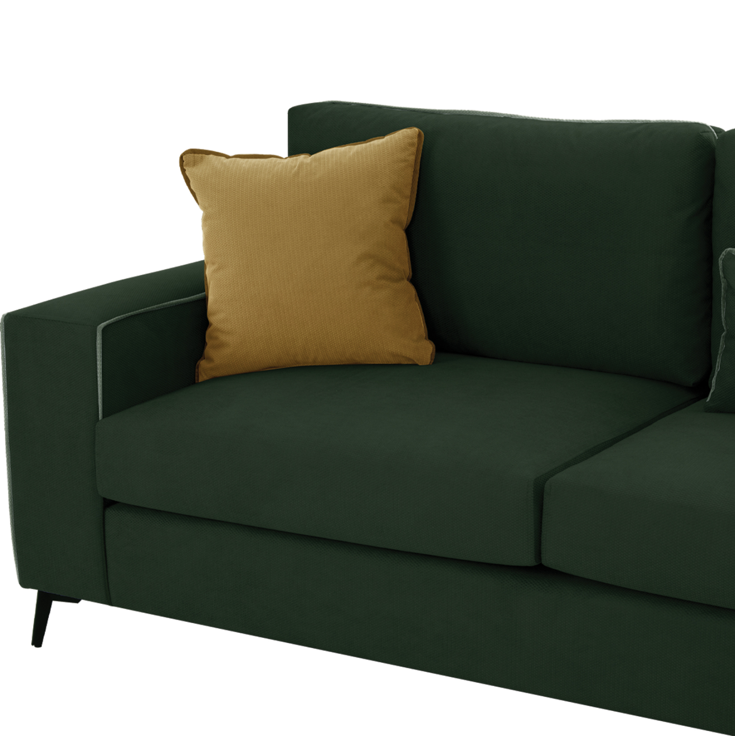 Ξεκινώντας από τα βασικά και τα προφανή, το χρώμα της ανάγλυφης επένδυσης του μεγάλου αυτού καναπέ είναι MAKALU07 κυπαρισσί. Διαθέτει 5 μαξιλάρια πλάτης στο ίδιο χρώμα και δύο μικρότερα διακοσμητικά μαξιλάρια σε χρυσό MAKALU05 χρώμα. Τα 4 μαξιλάρια καθίσματος σε συνδυασμό με αυτά της πλάτης, δίνουν την τέλεια αίσθηση άνεσης! Η ευχάριστη αισθητική πινελιά με το ρέλι σε κίτρινο χρώμα που διατρέχει τις γωνίες στα μπράτσα αλλά και τα μαξιλάρια πλάτης και τα διακοσμητικά μαξιλάρια ολοκληρώνει την χτυπητή διχρωμία του καναπέ με τον καλύτερο τρόπο. Το μεγάλο μαξιλάρι καθίσματος που σχηματίζει την γωνία δεν θα δυσκολέψει τον χρήστη φεύγοντας από την θέση του, επειδή διαθέτει «χρατς» και κολλάει στην ειδική επιφάνεια του σκελετού.