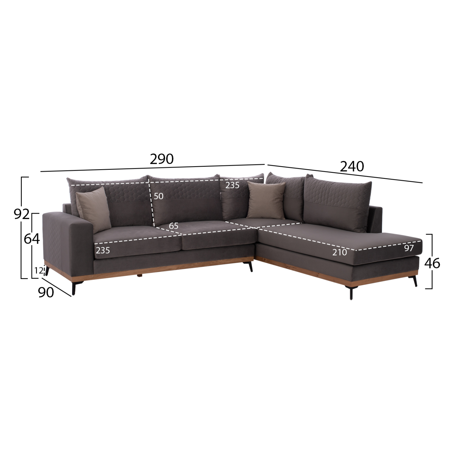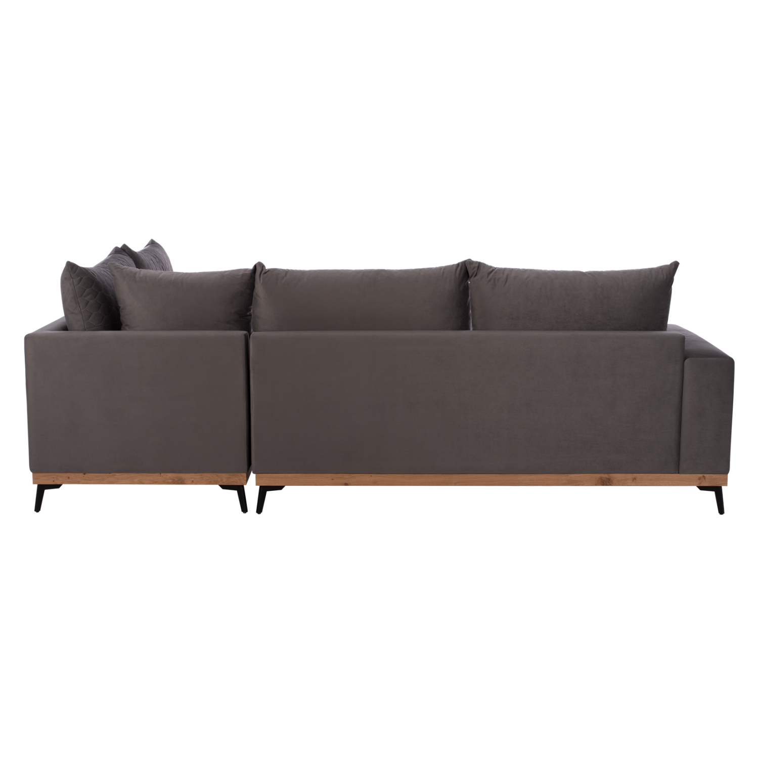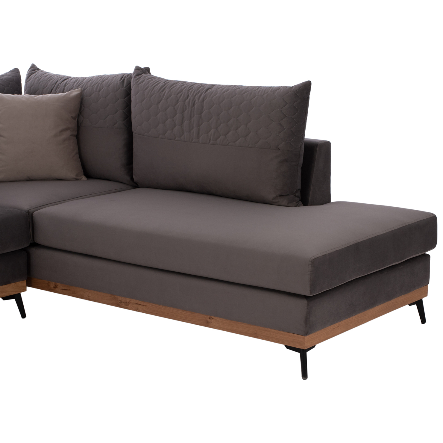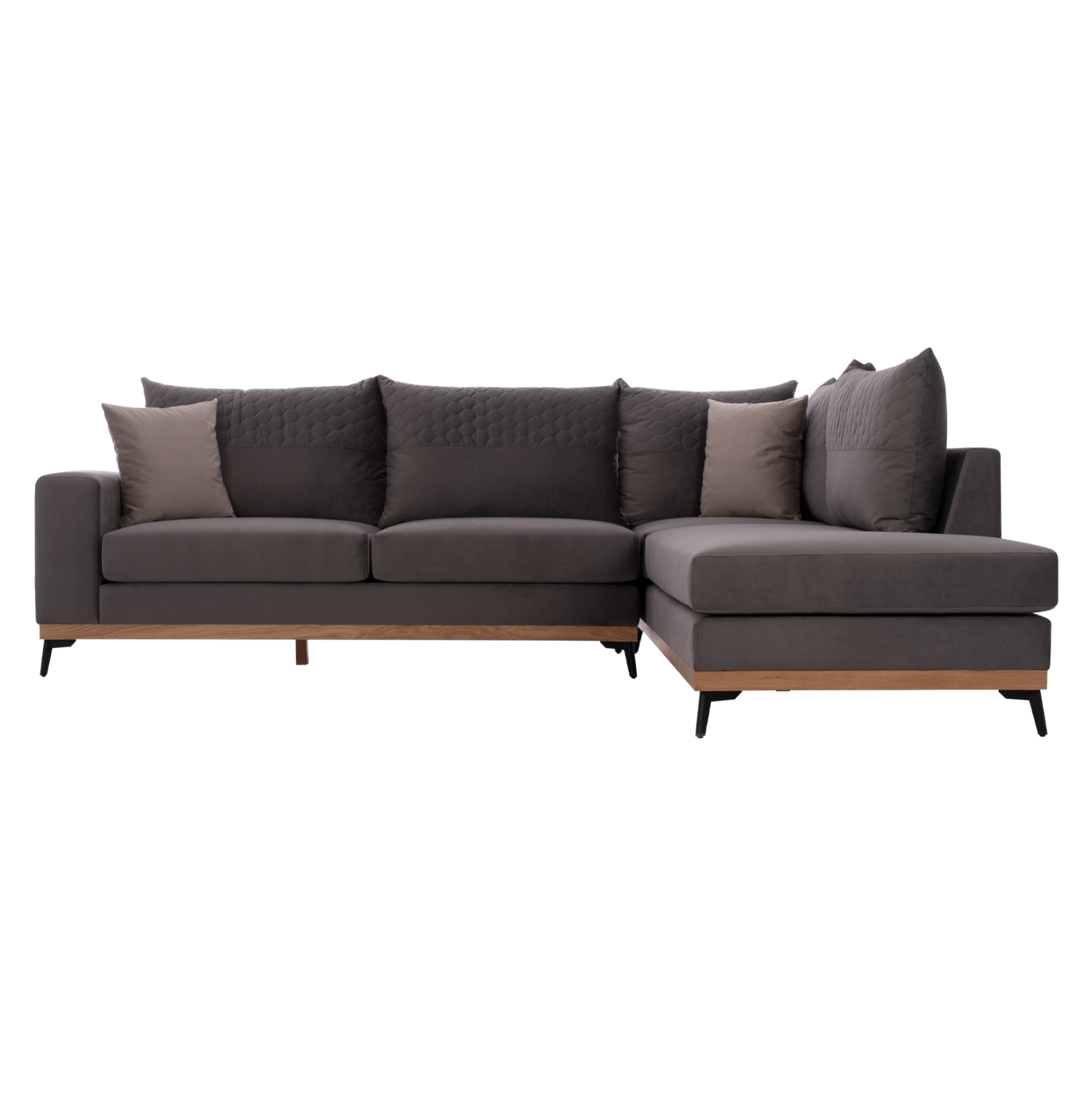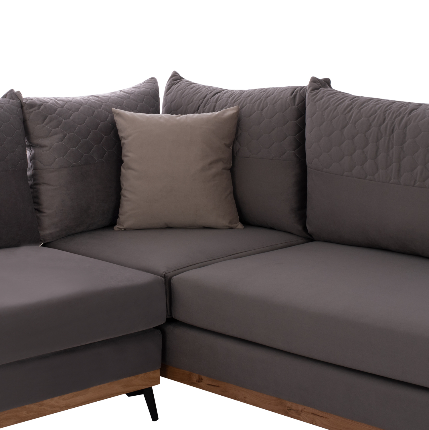 Ξεκινώντας από τα βασικά και τα προφανή, το χρώμα της βελούδινης επένδυσης του μεγάλου αυτού καναπέ είναι SAHARA 13- γκρι. Διαθέτει 5 μαξιλάρια πλάτης στο ίδιο χρώμα και δύο μικρότερα διακοσμητικά μαξιλάρια σε SAHARA 16- ανοιχτό γκρι χρώμα. Τα 4 μαξιλάρια καθίσματος σε συνδυασμό με αυτά της πλάτης, δίνουν την τέλεια αίσθηση άνεσης! Τα μαξιλάρια πλάτης έχουν τεχνοτροπία καπιτονέ κατά το ήμισυ, όπως υπάρχει και μια πανέμορφη καπιτονέ λωρίδα στο μεγάλο μπράτσο. Τα μαξιλάρια στο πίσω μέρος τους, έχουν πιο ανοιχτό γκρι χρώμα, ενώ ακόμα πιο ανοιχτό είναι το χρώμα των δύο μικρών διακοσμητικών μαξιλαριών. Το μεγάλο μαξιλάρι καθίσματος που σχηματίζει την γωνία δεν θα δυσκολέψει τον χρήστη φεύγοντας από την θέση του, επειδή διαθέτει «χρατς» και κολλάει στην ειδική επιφάνεια του σκελετού. Το κομμάτι που δημιουργεί την δεξιά γωνία, είναι κουμπωτό και συνδέεται με τον υπόλοιπο καναπέ αρμονικά με ενισχυμένους γαλβανιζέ αναρτήρες πάνελ (κατακόρυφα συρταρωτά) για τεράστια αντοχή και ευκολία στην χρήση.