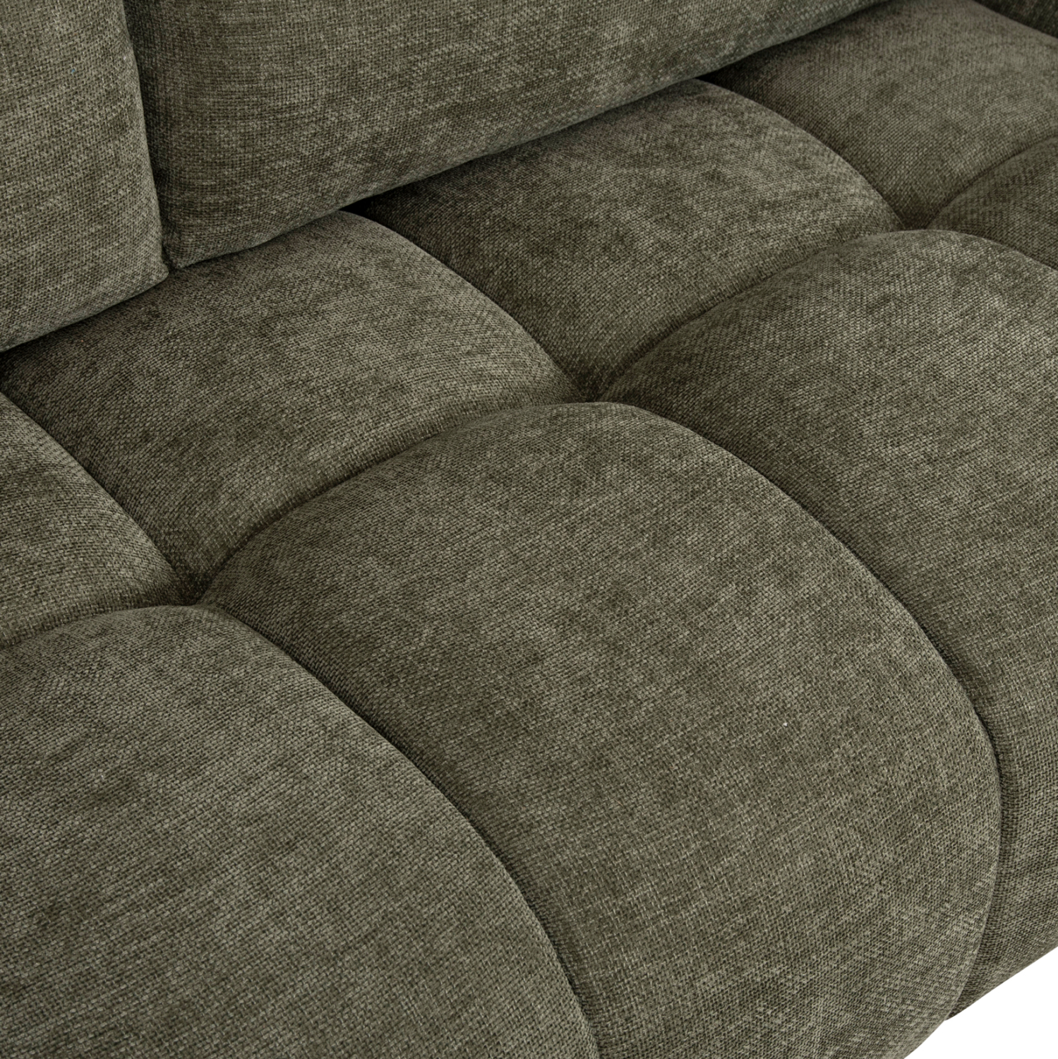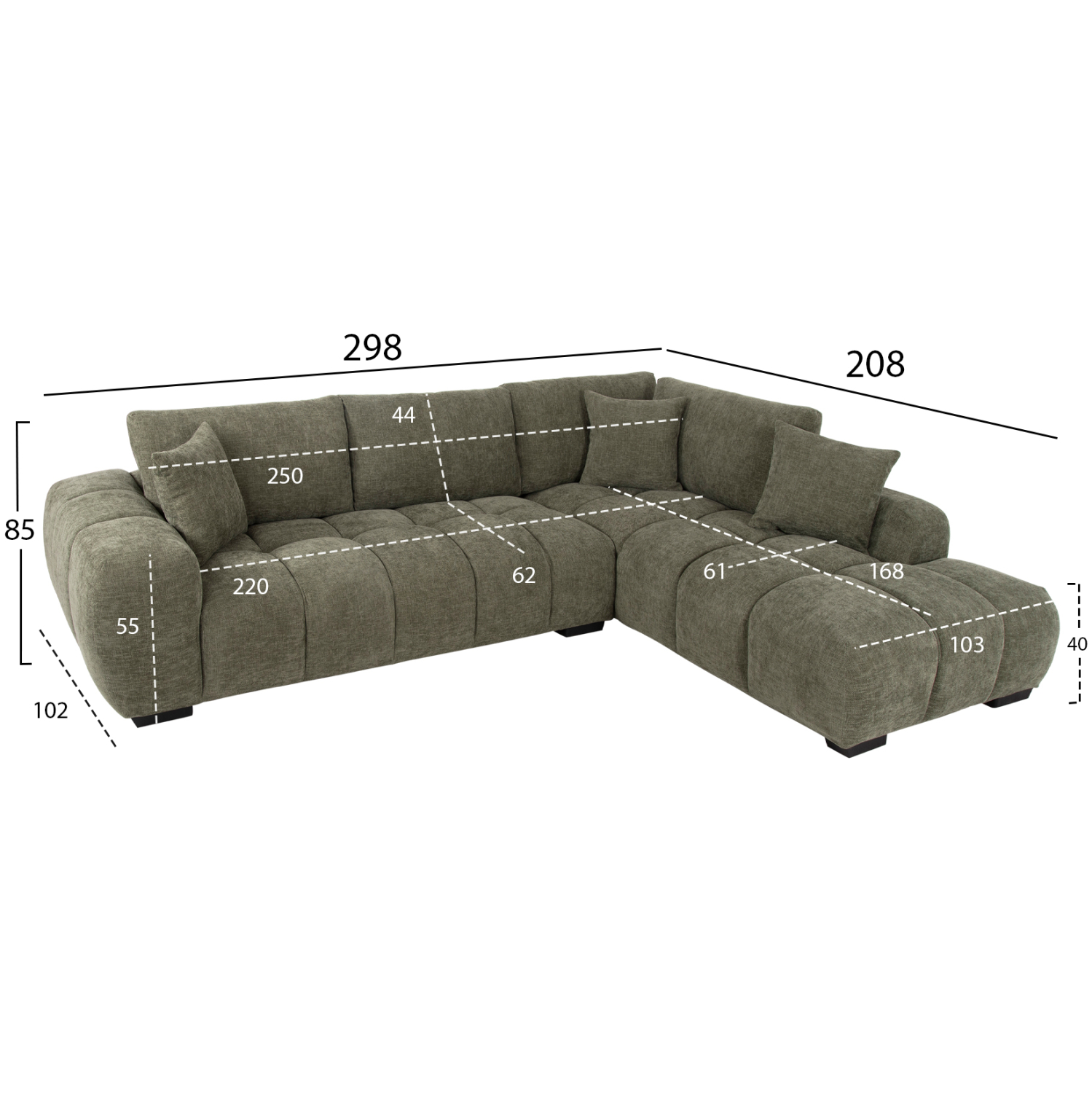 Σας παρουσιάζουμε τον COVEN, έναν υπέροχο μεγάλο καναπέ σε διαμόρφωση ΔΕΞΙΑΣ γωνίας (όπως τον κοιτάς) επενδυμένο με ποιοτικό ύφασμα σε ΠΡΑΣΙΝΟ χρώμα. Ξεκινώντας από το design, ο καναπές φτάνει μέχρι πολύ χαμηλά σε στυλ «ποδιάς» και διαθέτει φαρδιά χαμηλά πόδια-βάσεις σε μαύρο χρώμα. Τα μπράτσα είναι εντυπωσιακά φαρδιά, ενώ η επένδυση είναι σε στυλ καπιτονέ με τις έντονες ραφές! Το κομμάτι που σχηματίζει την γωνία είναι ίδιας αισθητικής και ενώνεται με τον κυρίως καναπέ με κατακόρυφους αναρτήρες πάνελ. Η πλάτη είναι χαμηλή και διαθέτει 4 μαξιλάρια πλάτης με «καραμέλες»(μακρόστενα κυλινδρικά μαξιλάρια) στο πίσω μέρος τους για καλύτερη στήριξη, αλλά και 3 μικρότερα διακοσμητικά μαξιλαράκια. Το κάθισμα διαθέτει γεμίσματα αφρού μεσαίας σκληρότητας σε συνδυασμό με ελατήρια pocket springs, προσφέροντας απαράμιλλη άνεση. Και φυσικά, σας προσφέρουμε αυτόν τον καναπέ με εγγύηση σκελετού 3 ετών!