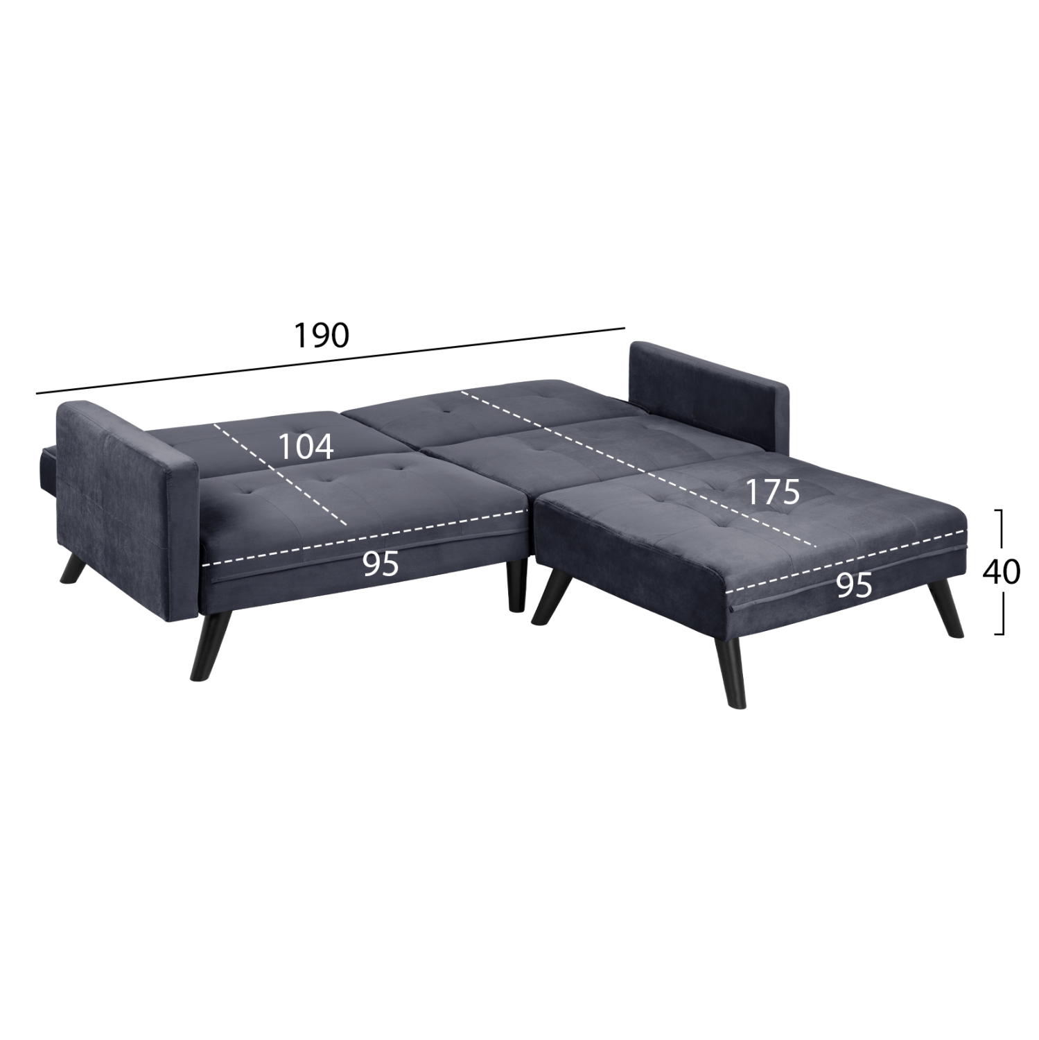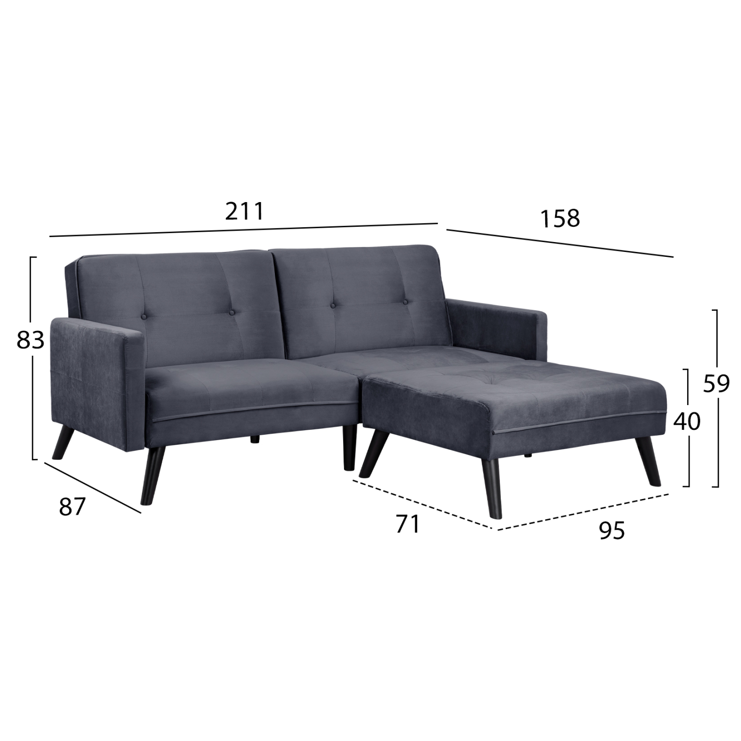 Καναπές γωνία κρεβάτι, με υποπόδιο, επενδεδυμένος με βελούδινο ύφασμα σε γκρι απόχρωση 211X158X83Y εκ.
