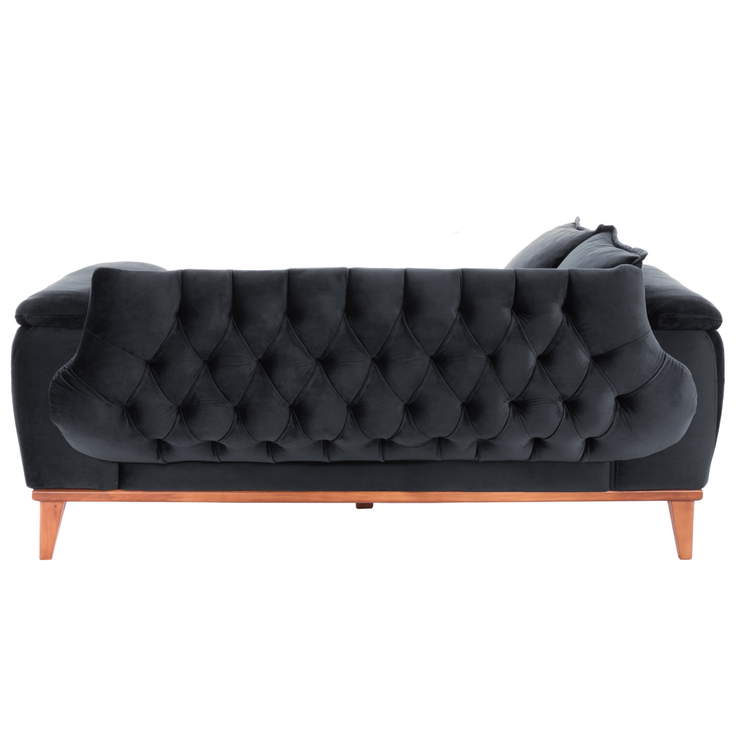 Αλλά δεν είναι μόνο το χρώμα και το καπιτονέ που κάνουν αυτόν τον καναπέ να ξεχωρίζει. Τα πόδια είναι ψηλά και ακριβώς πάνω από τα πόδια υπάρχει ένα ξύλινο πλαίσιο που διατρέχει ολόκληρο τον καναπέ, σε φυσικό χρώμα ξύλου, με αποτέλεσμα να δημιουργείται μια πανέμορφη διχρωμία με το ΜΑΥΡΟ της επένδυσης.