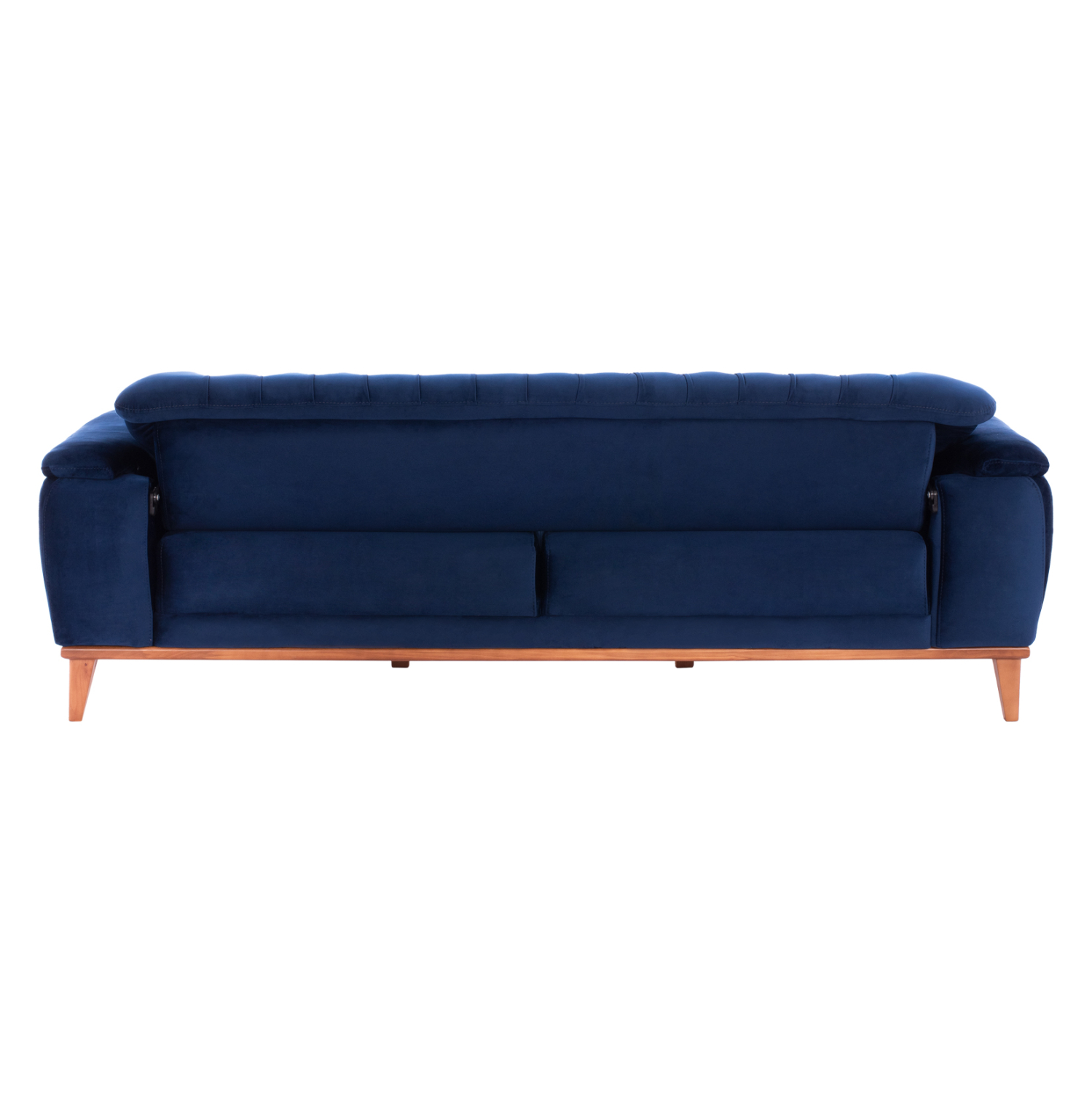 Αλλά δεν είναι μόνο το χρώμα και το καπιτονέ που κάνουν αυτόν τον καναπέ να ξεχωρίζει. Τα πόδια είναι ψηλά και ακριβώς πάνω από τα πόδια υπάρχει ένα ξύλινο πλαίσιο που διατρέχει ολόκληρο τον καναπέ, σε φυσικό χρώμα ξύλου, με αποτέλεσμα να δημιουργείται μια πανέμορφη διχρωμία με το έντονο μπλε της επένδυσης.