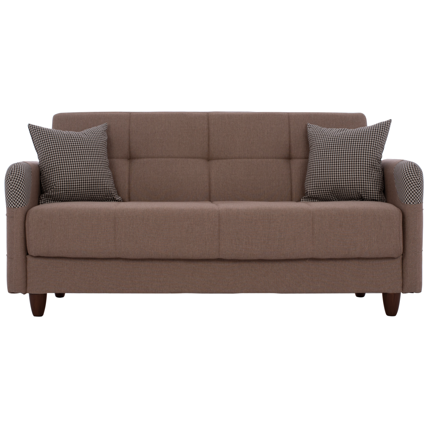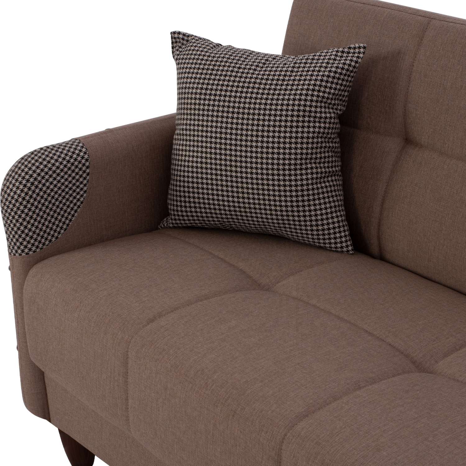 Η επένδυσή του είναι με εξαιρετικής ποιότητας μπεζ ύφασμα ενώ τα διακοσμητικά μαξιλαράκια, του δίνουν μια διαφορετική αισθητική πινελιά με ύφασμα σε καρό σχεδιασμό που υπάρχει και στις εμπρός γωνίες των μπράτσων. Η επένδυση έχει τεχνοτροπία καπιτονέ σε μεγάλα τετράγωνα τόσο στο άνετο κάθισμα και στην πλάτη, όσο και στα λεπτά μπράτσα.