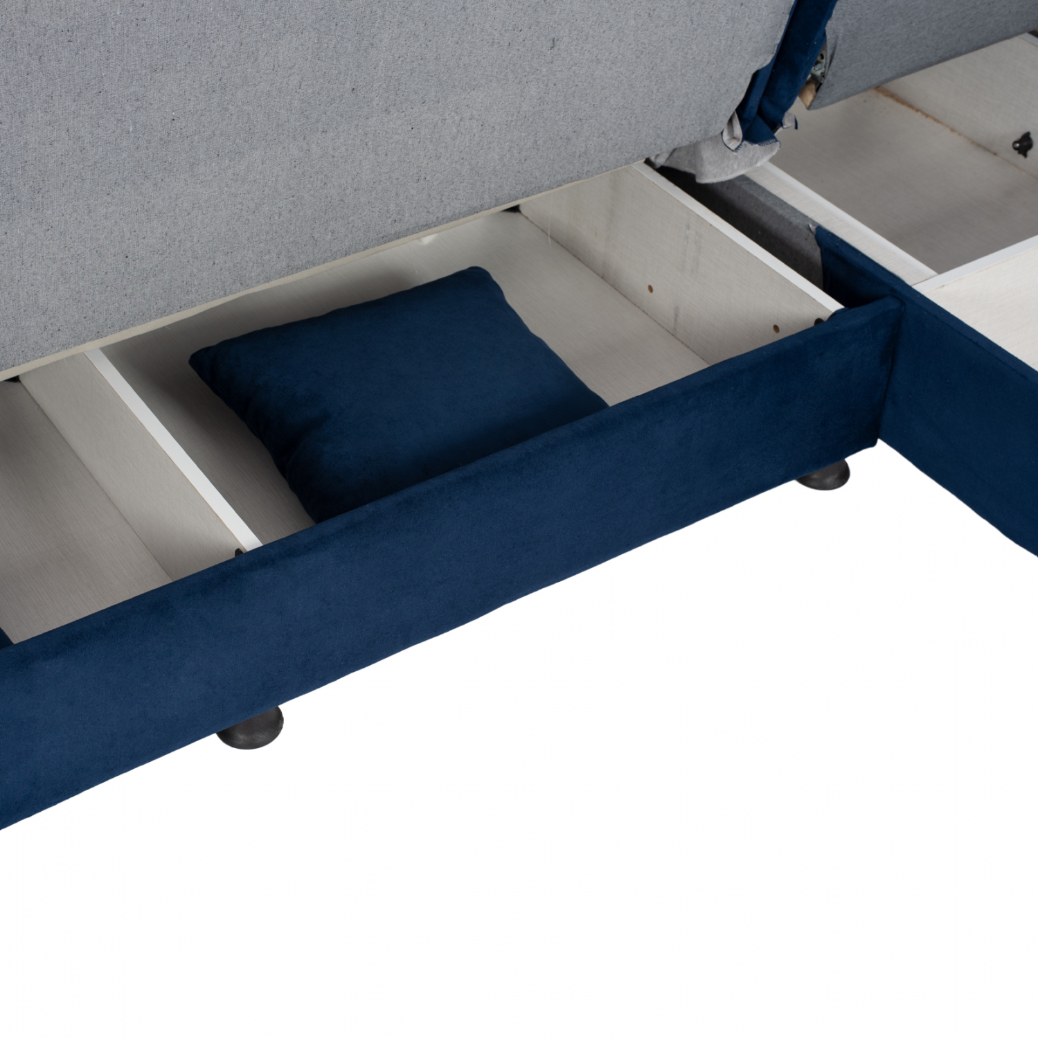 Καναπές γωνία ,επενδεδυμένος με ύφασμα σε μπλε απόχρωση.
