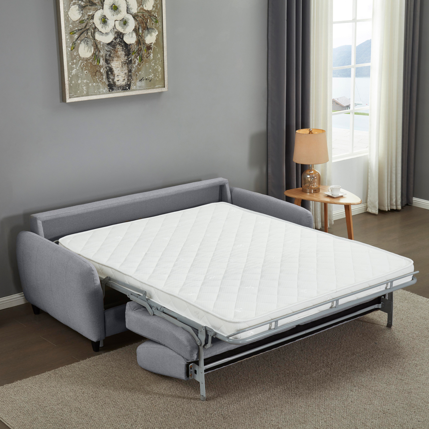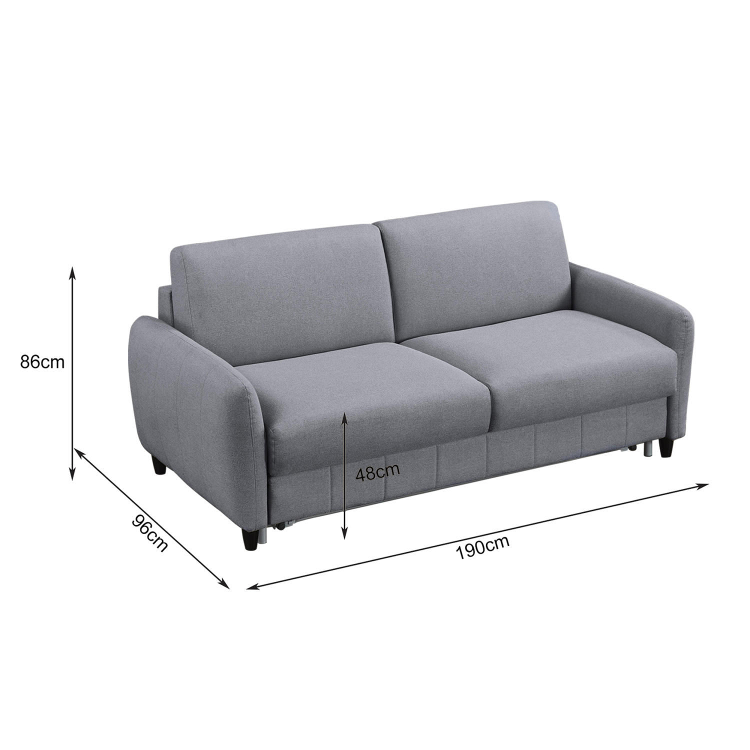 Ο διθέσιος καναπές κρεβάτι ETUDINE είναι μια κομψή και απολύτως λειτουργική επιλογή για κάθε μοντέρνο σπίτι. Η γκρι υφασμάτινη επένδυση, τα στρογγυλεμένα λεπτά μπράτσα και τα διακριτικά μαύρα ποδαράκια προσδίδουν μια καθαρή, minimal αισθητική, ενώ ο ενσωματωμένος μηχανισμός μετατροπής σε κρεβάτι τον καθιστά ιδανικό τόσο για καθημερινή χρήση όσο και για φιλοξενούμενους.