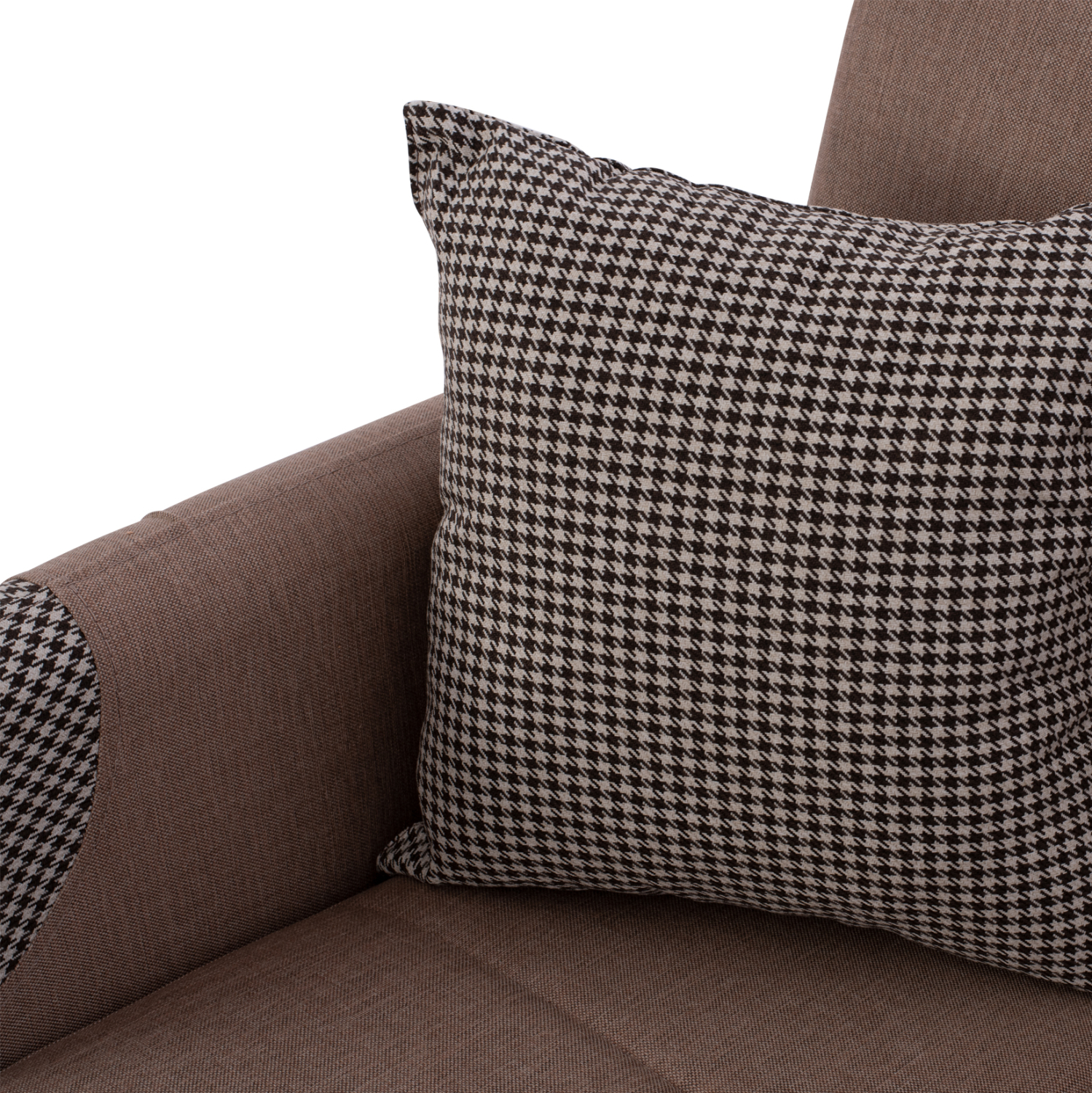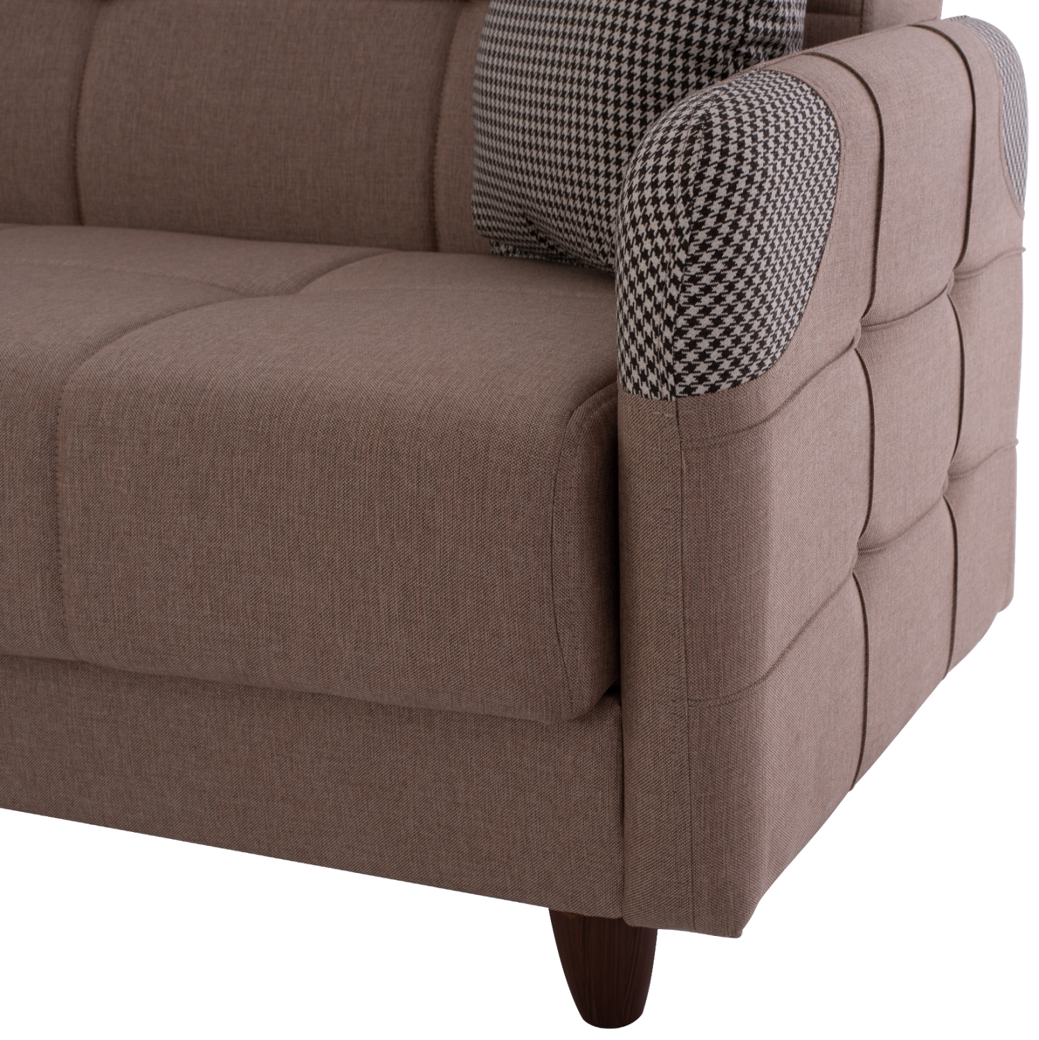 Η επένδυσή του είναι με εξαιρετικής ποιότητας μπεζ ύφασμα ενώ τα διακοσμητικά μαξιλαράκια, του δίνουν μια διαφορετική αισθητική πινελιά με ύφασμα σε καρό σχεδιασμό που συνεχίζει και στις εμπρός γωνίες των μπράτσων. Η επένδυση έχει τεχνοτροπία καπιτονέ σε μεγάλα τετράγωνα τόσο στο άνετο κάθισμα και στην πλάτη, όσο και στα λεπτά μπράτσα.