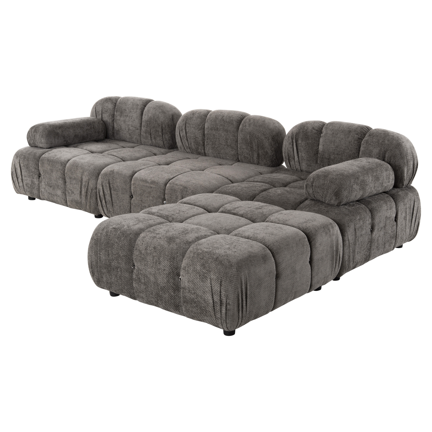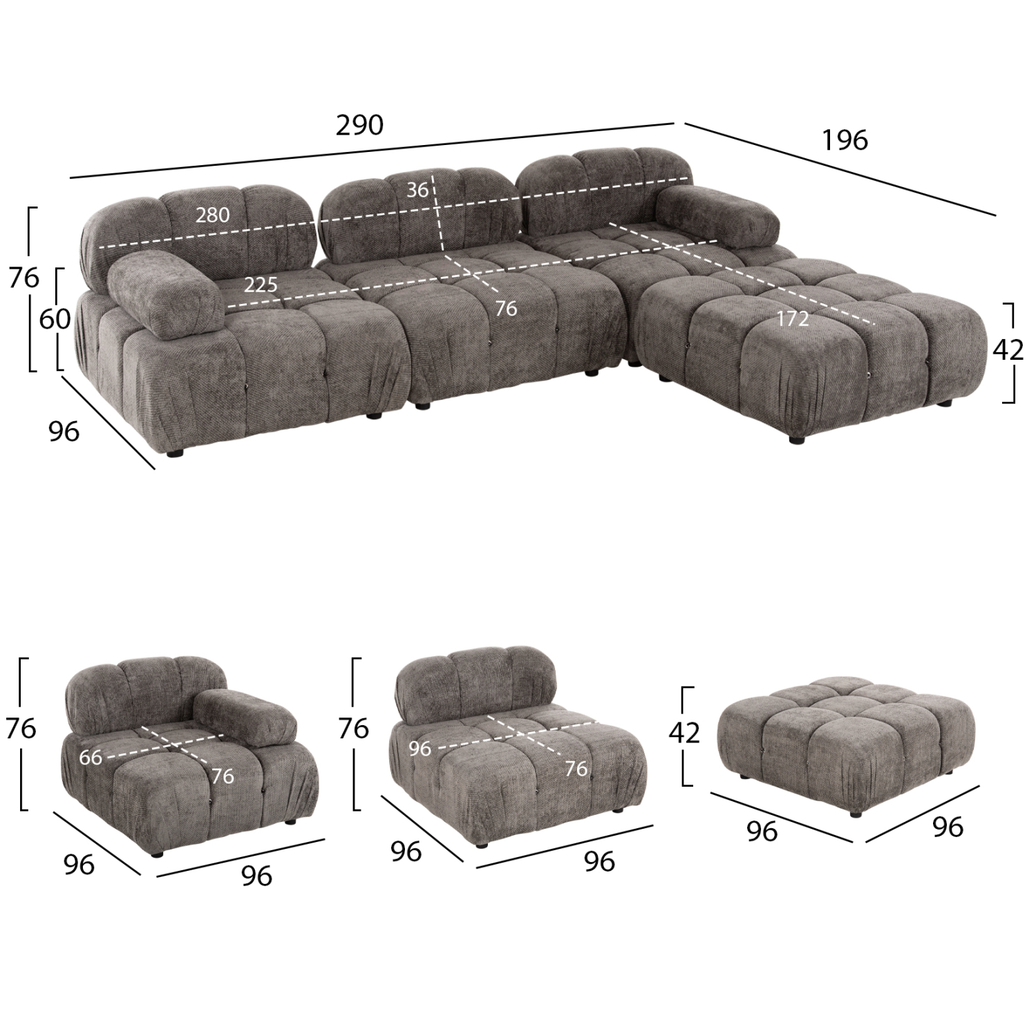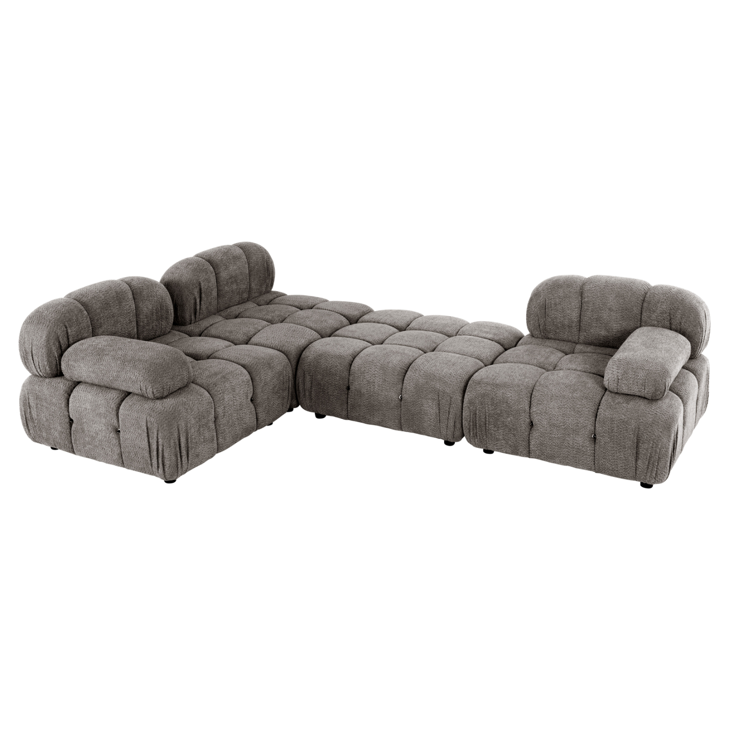 Ξεκινώντας από τα βασικά και τα προφανή, το χρώμα της εξαιρετικά ποιοτικής επένδυσης του καναπέ είναι ΓΚΡΙ. Η τεχνοτροπία της επένδυσης είναι καπιτονέ σε όλο το εύρος του καναπέ. Αποτελείται από 4 ξεχωριστά τετράγωνα κομμάτια, τα οποία μπορείτε να τα τοποθετήσετε όπως εσείς θέλετε! Τα 3 από τα 4 κομμάτια διαθέτουν χαμηλή πλάτη, ενώ το τέταρτο μοιάζει περισσότερο με ένα μεγάλο σκαμπό. Τα 2 μακρόστενα μαξιλάρια ενώνονται στον καναπέ με «χρατς» (Velcro). Περνώντας στο κάθισμα του καναπέ, αυτό που εντυπωσιάζει είναι η κατασκευή του με pocket springs, πράγμα που απογειώνει πραγματικά την αίσθηση άνεσης που προσφέρει!