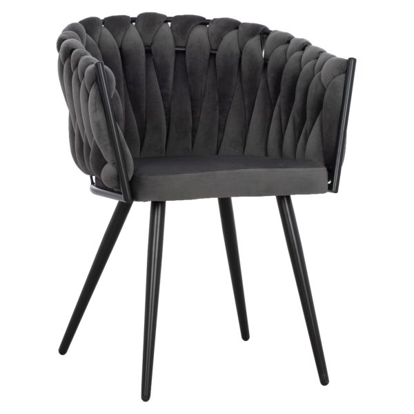 Καρέκλα επενδυμένη με ύφασμα βελούδο σε γκρι απόχρωση και μεταλλικό μαύρο σκελετό.