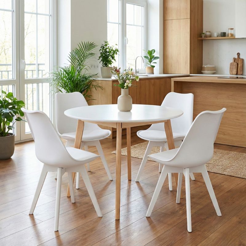 - Σταθερά ξύλινα πόδια σε λευκό χρώμα, που εξασφαλίζουν αντοχή και μοντέρνα αισθητική.