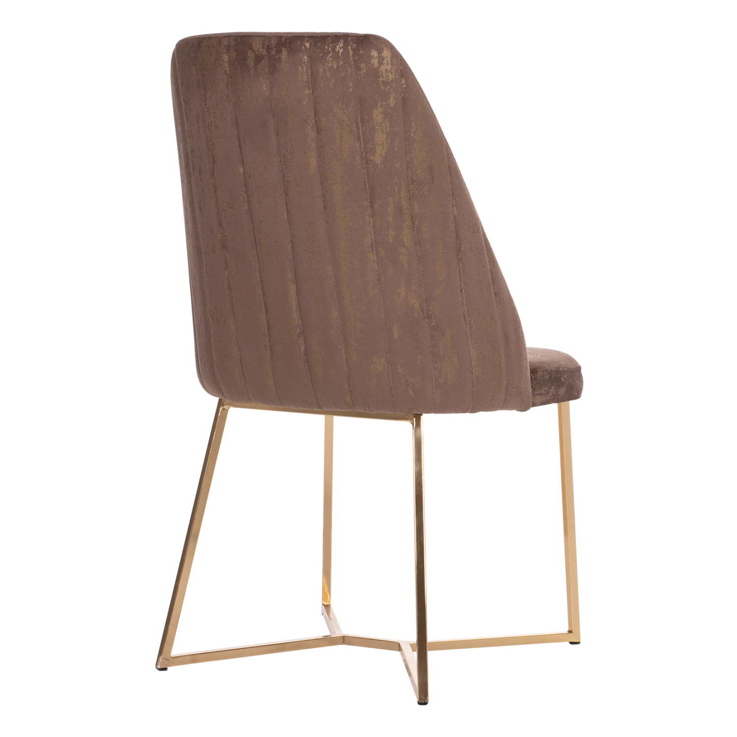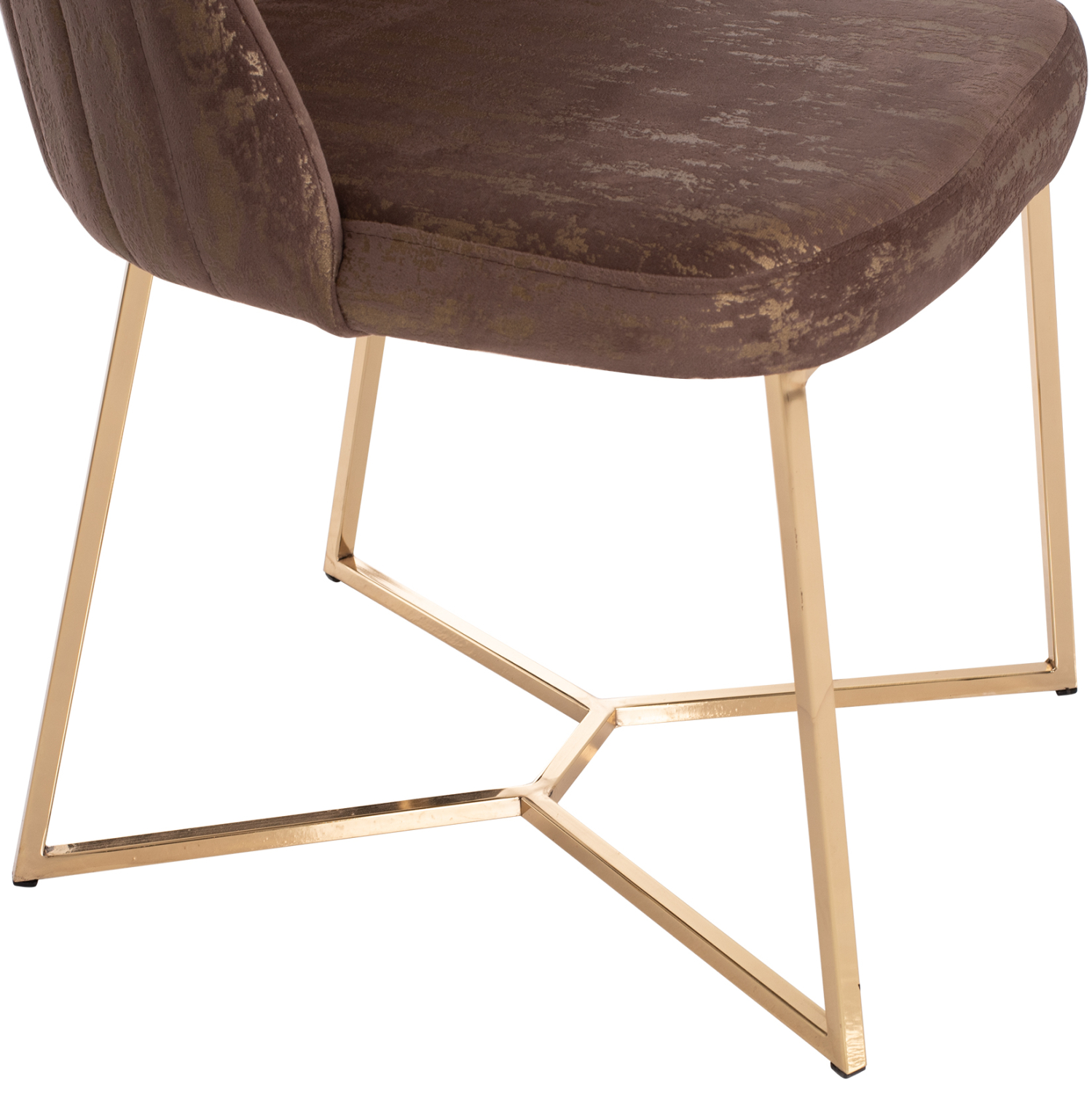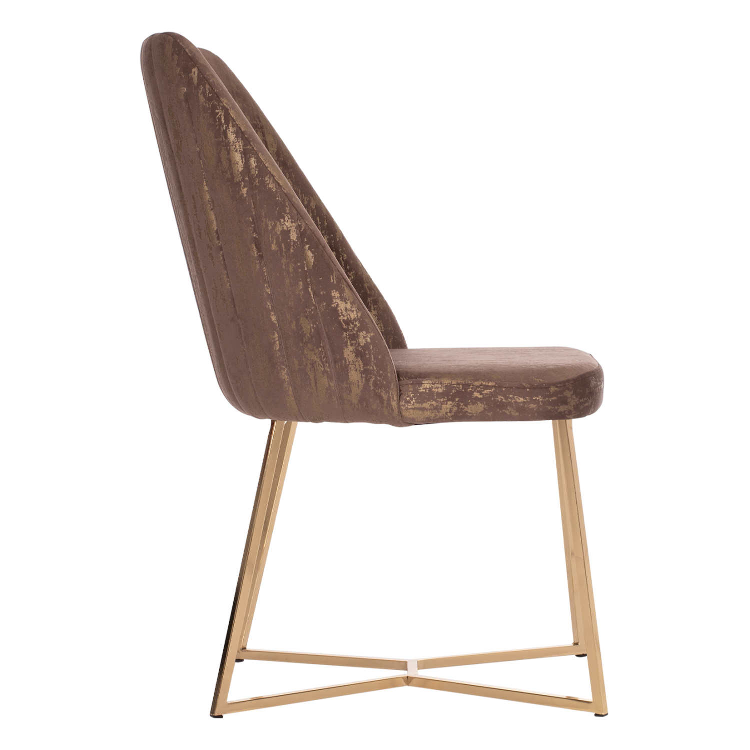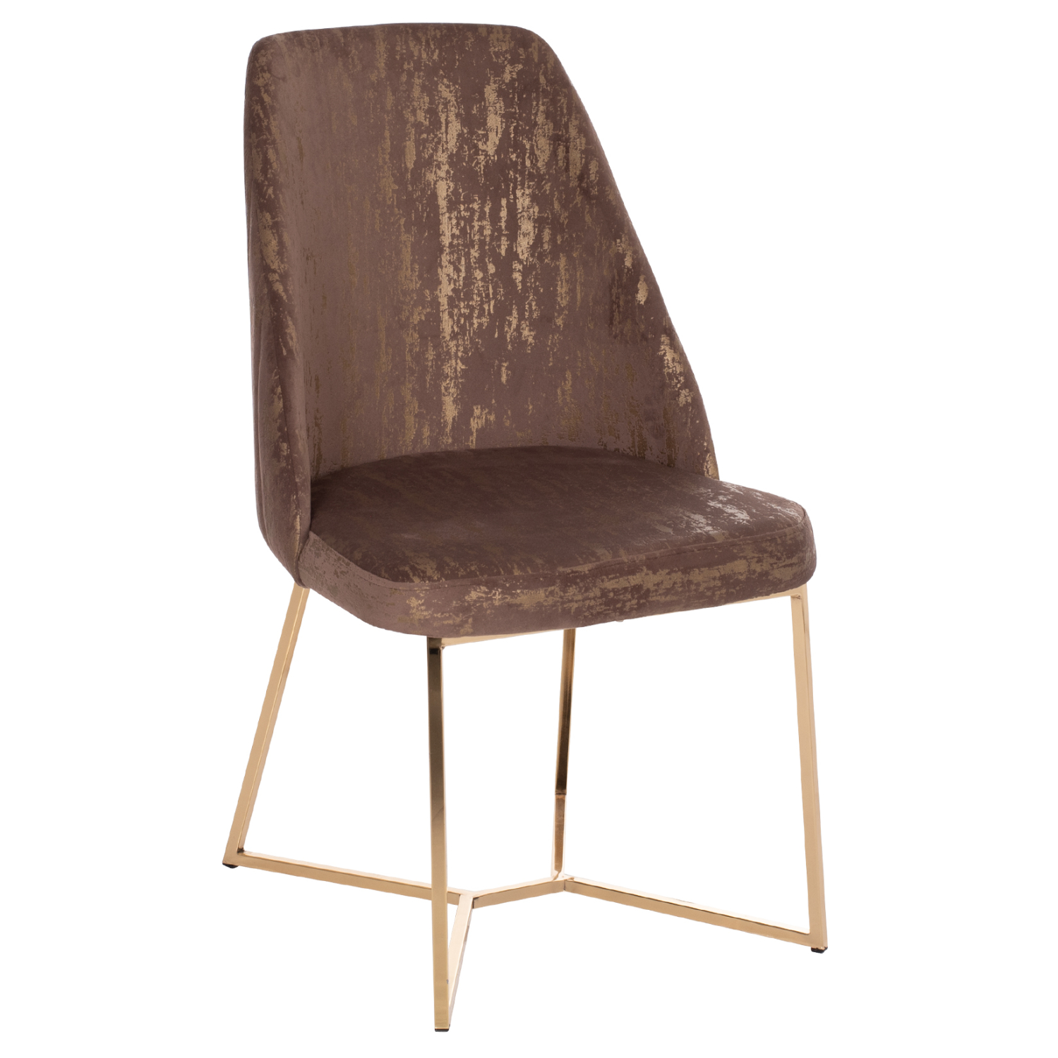 Αυτή είναι η καρέκλα ZIZI κυρίως για επαγγελματική χρήση, σε ΚΑΦΕ χρώμα με χρυσά «νερά», και βάση μεταλλική σε χρυσό χρώμα και σε χιαστί διάταξη, αντί για τα κλασσικά πόδια. Διαθέτει ψηλή και κυρτή πλάτη, πράγμα που προσφέρει άνεση και πρακτικότητα, όπως και το κάθισμα που αποτελείται από αφρώδες υλικό μέτριας σκληρότητας.