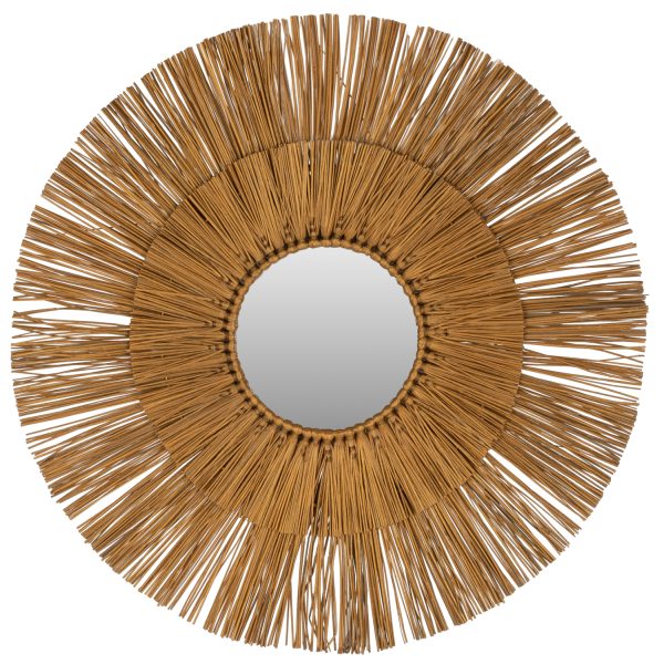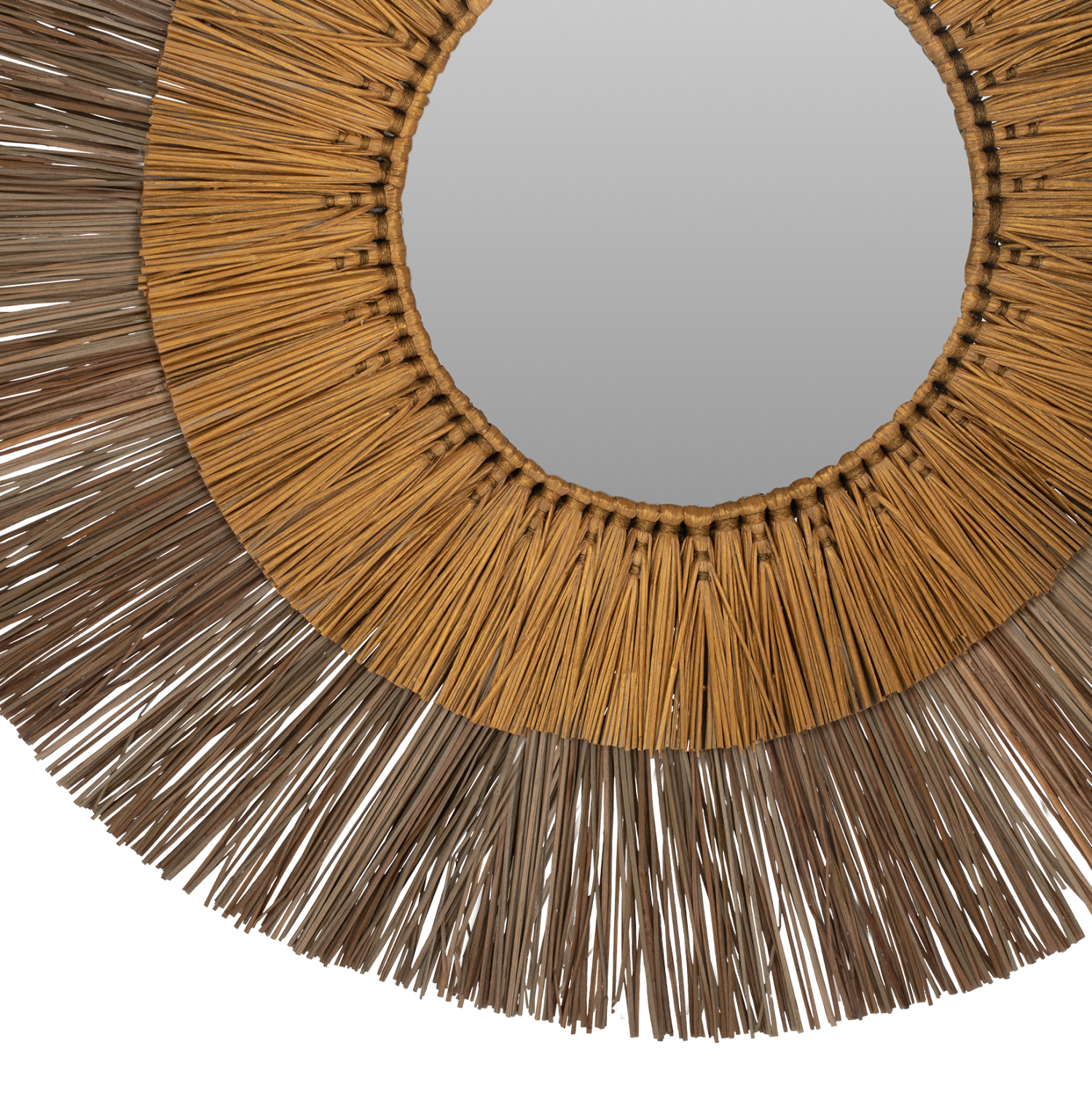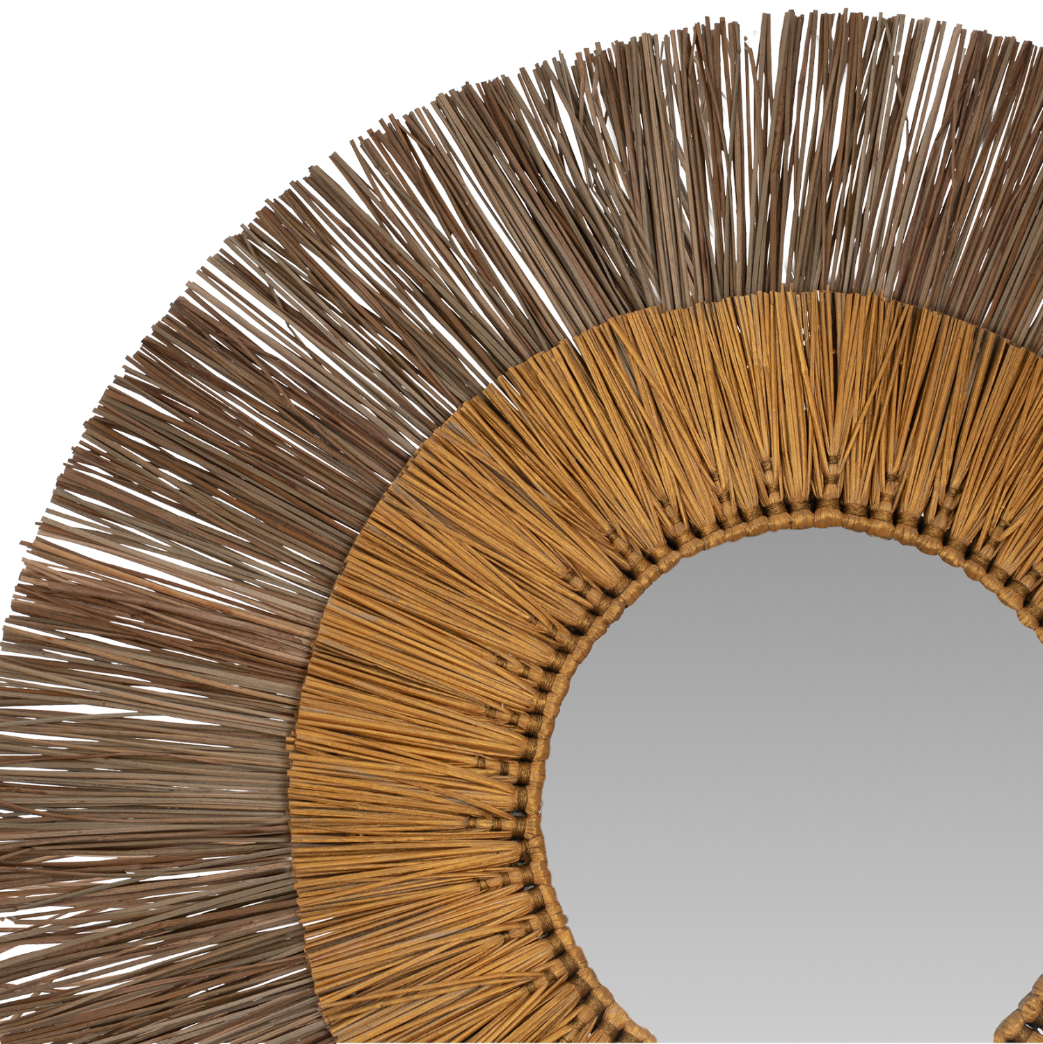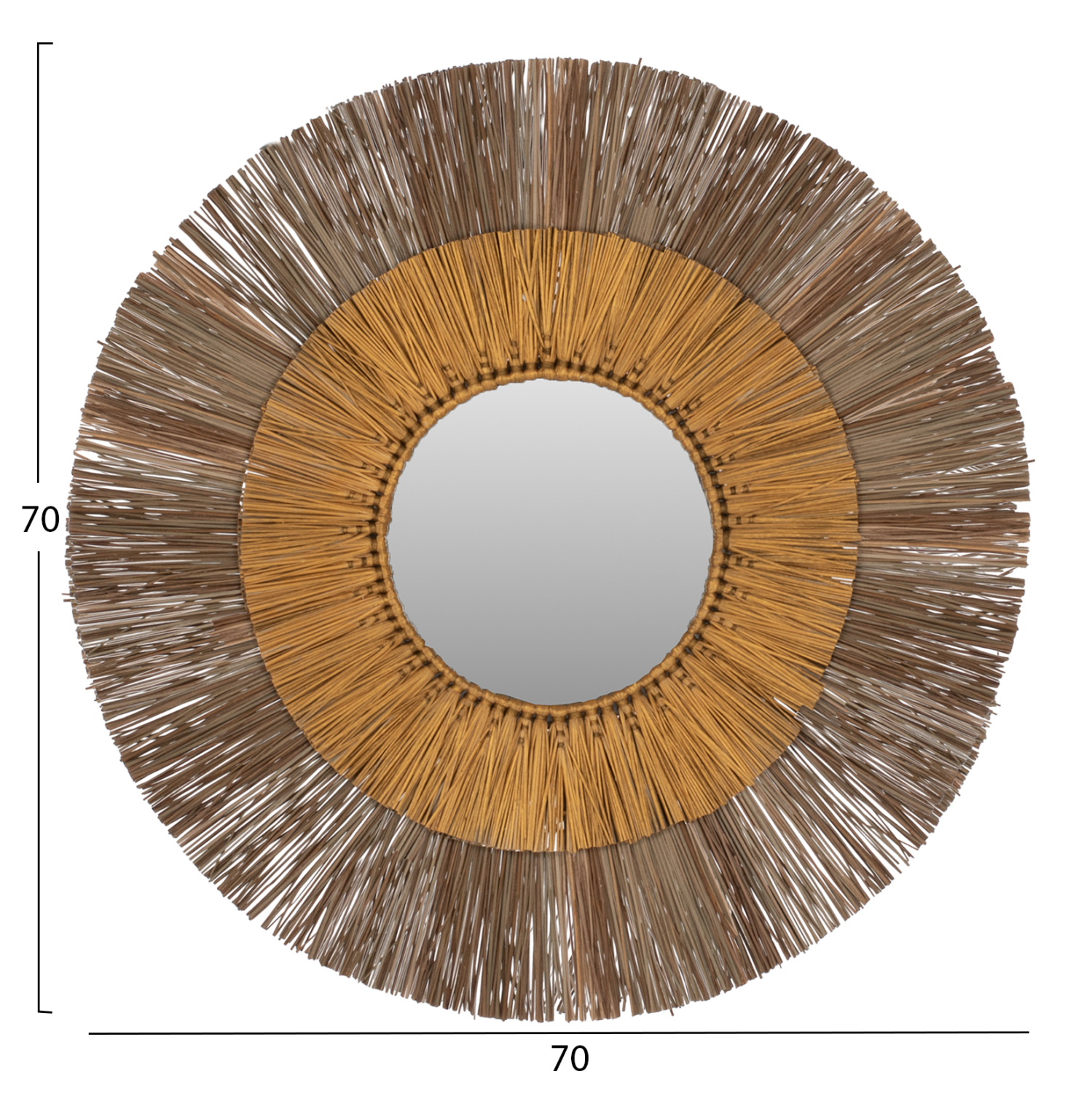 O στρογγυλός καθρέπτης ΗΜ7800 είναι πραγματικά ένα εντυπωσιακό κομμάτι στην διακόσμηση του χώρου σας! Το design του είναι όμορφο με διπλό στρογγυλό πλαίσιο από το χόρτο Mendong, το οποίο στο κέντρο του «φιλοξενεί» τον καθρέπτη, ενώ το κάτω πλαίσιο είναι σε φυσικό χρώμα και το επάνω είναι σε χρυσό χρώμα. Το χαρακτηριστικό είναι ότι ο καθρέφτης είναι μικρός και αποτελεί κυρίως διακοσμητικό στοιχείο.