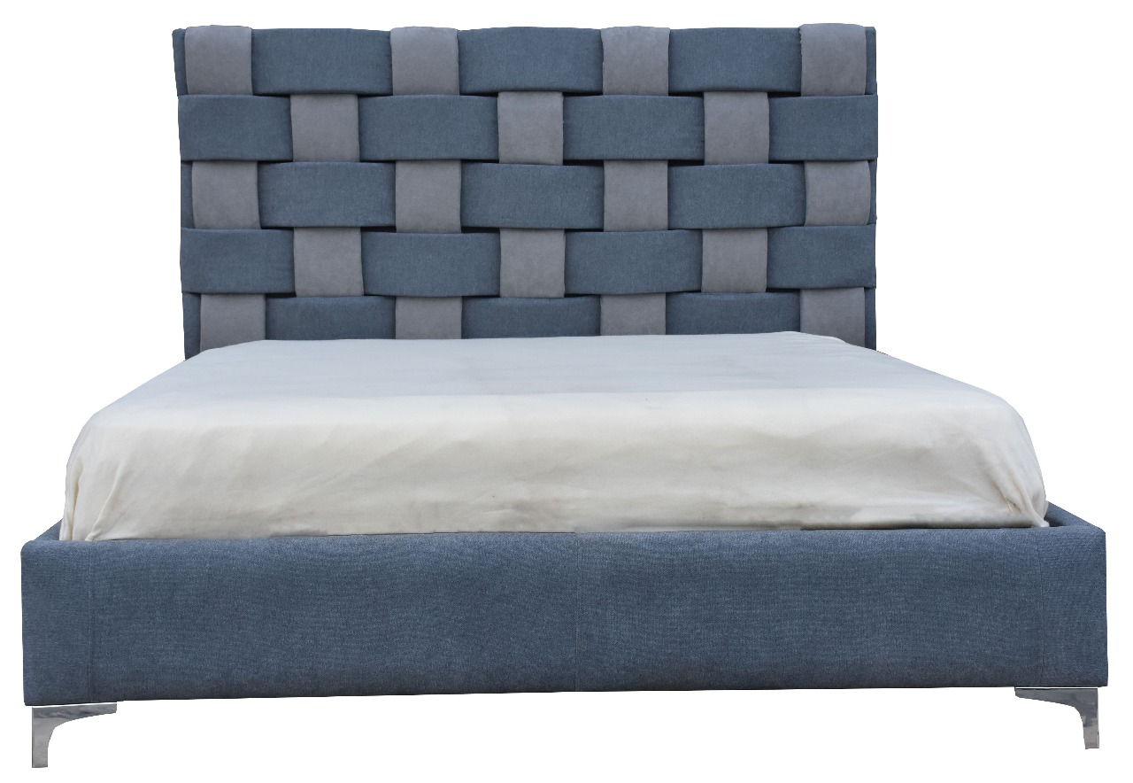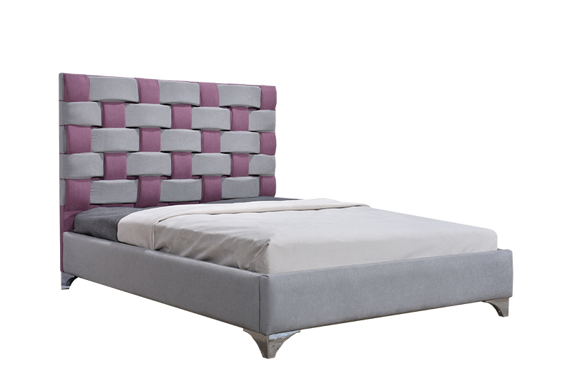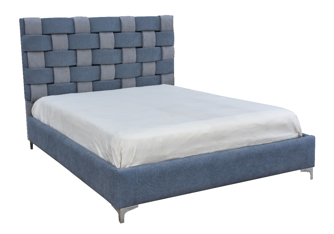 Κρεβάτι με ιδιαίτερο κεφαλάρι αποτελούμενο από καρό πυκνή πλέξη.
