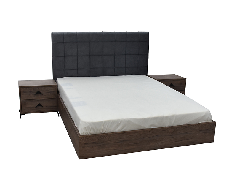 Κρεβάτι σε μοντέρνο ύφος που συνδυάζει ξύλο και ύφασμα. Το κεφαλάρι είναι ντυμένο με ύφασμα που φέρει διακοσμητικά σχέδια από γαλλική ραφή. Η βάση αποτελείται από μελαμίνη μεγάλης αντοχής αλλά μπορεί να είναι και ντυμένη με ύφασμα.
