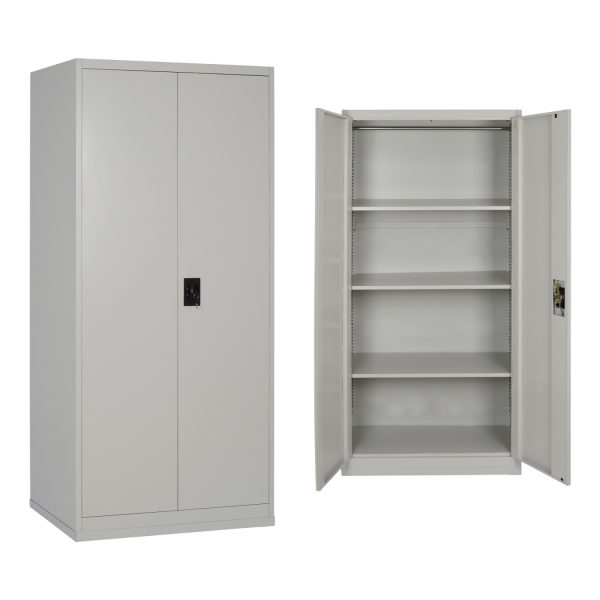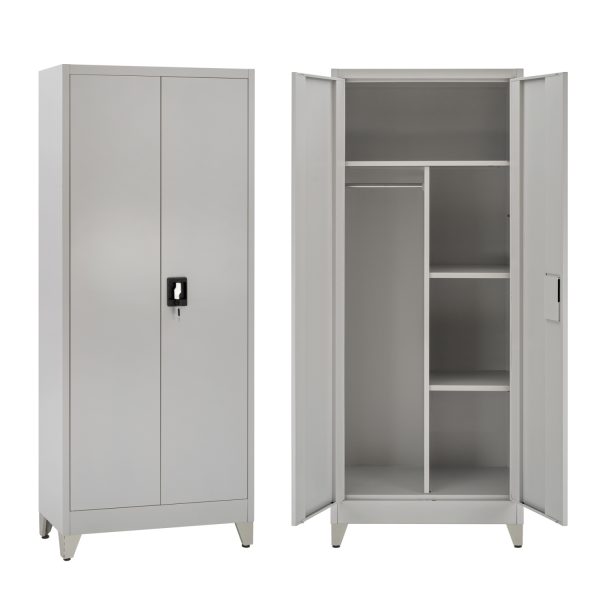 Η ντουλάπα διαθέτει δύο πόρτες με κλειδαριά για ασφαλή φύλαξη αντικειμένων και τρία ρυθμιζόμενα ράφια, ώστε να προσαρμόζεται εύκολα στις ανάγκες σας — ιδανική για εργαλεία, φακέλους, ρούχα ή εξοπλισμό. Επιπροσθέτως, διαθέτει και πόδια ύψους 10 εκατοστών με ρυθμιστές ύψους για εσάς που θέλετε η ντουλάπα να μην «πατάει» απευθείας στο δάπεδο.