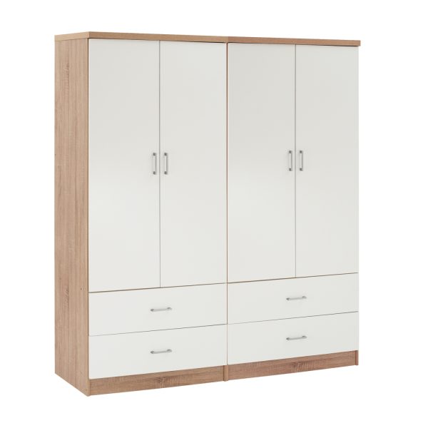 Γνωρίστε την 4-φυλλη ντουλάπα-γκαρνταρόμπα REINA. Πρόκειται για μια μεγάλη ντουλάπα με 4 πόρτες, και στο εσωτερικό της υπάρχει μόνο μια INOX μπάρα για κρέμαση ρούχων. Κάτω ακριβώς από τον χώρο της γκαρνταρόμπας υπάρχουν και 4 ευρύχωρα συρτάρια. Οι πόρτες αλλά και τα συρτάρια ανοίγουν με καλαίσθητα ασημί χερούλια. Είναι κατασκευασμένη από μελαμίνη σε ΛΕΥΚΟ χρώμα και αισθητικά μπορεί να ταιριάξει με πολλά άλλα στυλ, χάρη και στις «καθαρές» γραμμές της.
