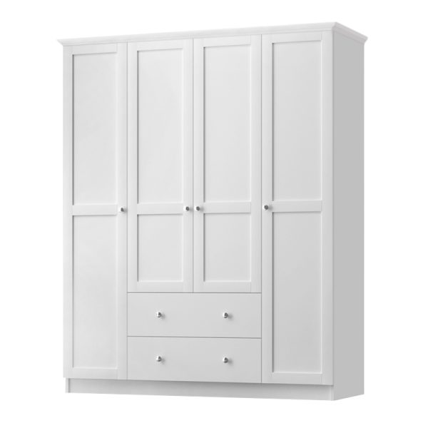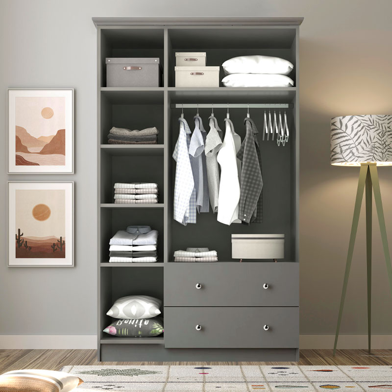- Μια κεντρική διπλή ντουλάπα, στο εσωτερικό της φέρει μια βέργα αλουμινίου για κρεμάστρες. Στο κάτω μέρος φέρει δύο πρακτικά συρόμενα συρτάρια και στα αριστερά η ντουλάπα περιλαμβάνει ράφια.