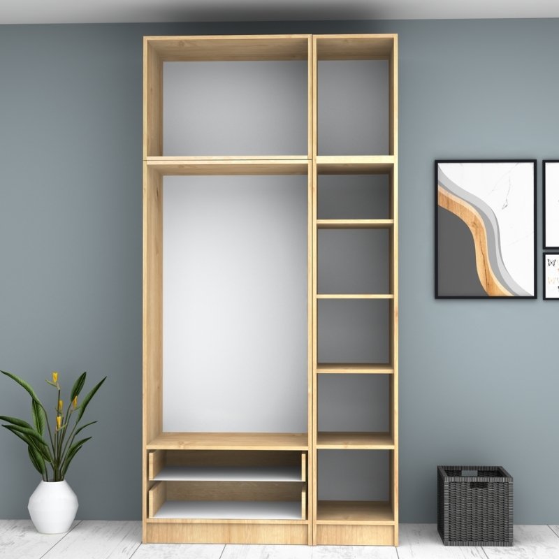 • Στο εσωτερικό της φέρει μία μεταλλική βέργα για κρεμάστρες και ράφια για μεγαλύτερη αποθήκευση. Στο κάτω μέρος φέρει δύο πρακτικά συρόμενα συρτάρια.
