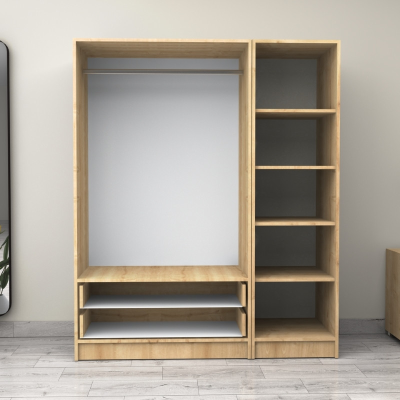 • Στο εσωτερικό της φέρει μια μεταλλική βέργα για κρεμάστρες και ράφια για μεγαλύτερη αποθήκευση. Στο κάτω μέρος φέρει δύο πρακτικά συρόμενα συρτάρια.