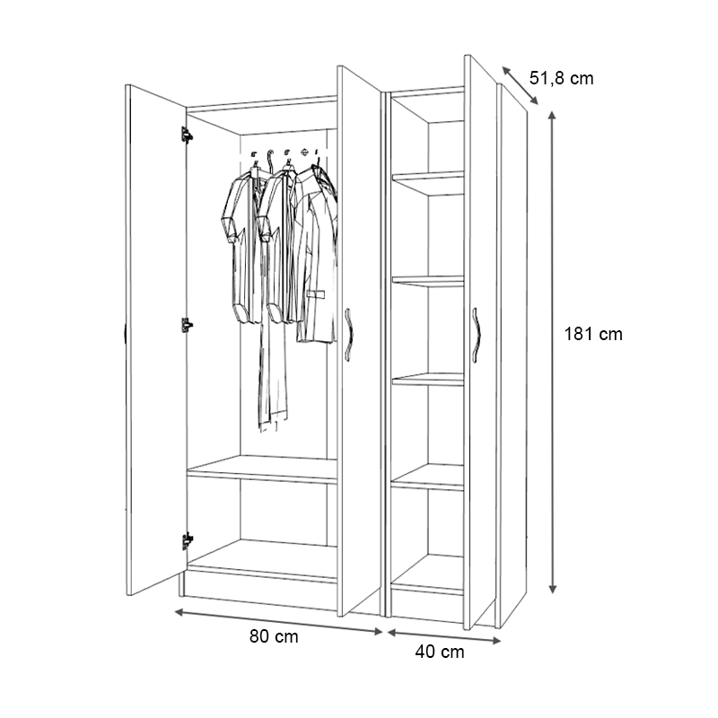 • Διαστάσεις δίφυλλης ντουλάπας: Μήκος 80 x Βάθος 51,8 x Ύψος 181 εκ.