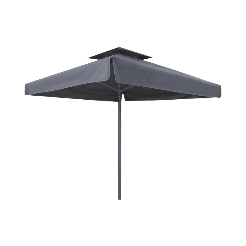 Τετράγωνη ομπρέλα αλουμινίου με τηλεσκοπικό μηχανισμό και διπλό αεραγωγό που επιτρέπει την κυκλοφορία του αέρα μειώνοντας ταυτόχρονα την πίεση του. Ιδανική επιλογή για επαγγελματική χρήση όπως beach bars, πισίνες και χώρους εστίασης.