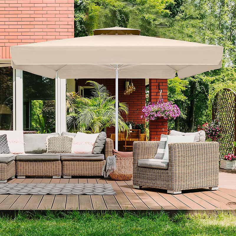 Τετράγωνη ομπρέλα αλουμινίου με τηλεσκοπικό μηχανισμό και διπλό αεραγωγό που επιτρέπει την κυκλοφορία του αέρα μειώνοντας ταυτόχρονα την πίεση του. Ιδανική επιλογή για επαγγελματική χρήση όπως beach bars, πισίνες και χώρους εστίασης.