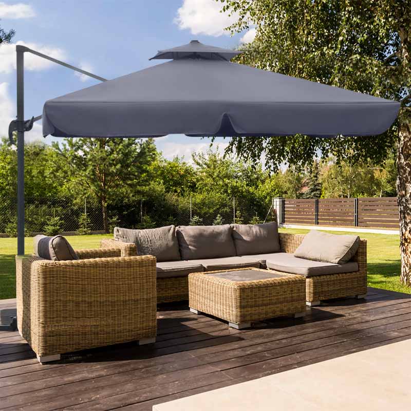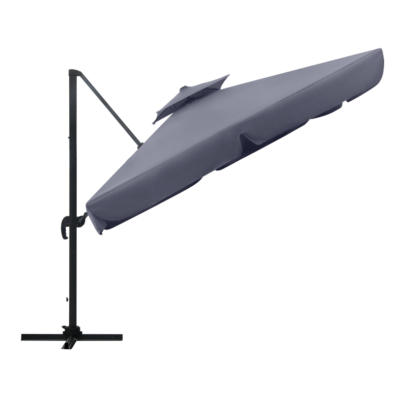 Τετράγωνη κρεμαστή ομπρέλα αλουμινίου με τηλεσκοπικό μηχανισμό και διπλό αεραγωγό που επιτρέπει την κυκλοφορία του αέρα μειώνοντας ταυτόχρονα την πίεση του. Ιδανική επιλογή για επαγγελματική χρήση όπως beach bars, πισίνες και χώρους εστίασης.