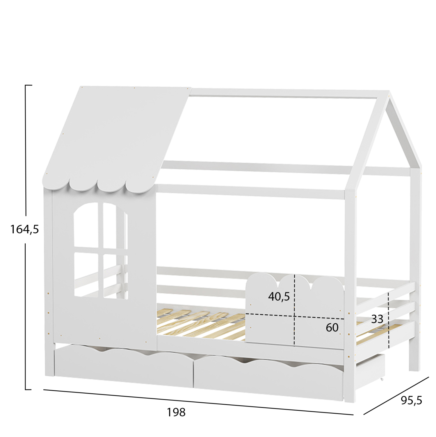 Το DOMER είναι ακόμα ένα καινούργιο παιδικό κρεβάτι τύπου Montessori που σημαίνει ότι έχει σχεδιαστεί σύμφωνα με το εκπαιδευτικό σύστημα Montessori, κατά το οποίο τα παιδιά μαθαίνουν καλύτερα, όταν επιλέγουν μόνα τους τι θα κάνουν. Το χαμηλό ύψος κρεβατιού χωρίς πόδια, βοηθά να εξερευνούν την αυτονομία τους και να ανεβοκατεβαίνουν από το κρεβάτι τους ελεύθερα ανά πάσα στιγμή. Είναι σε διάσταση για μονό στρώμα 90×190 εκ, και αποτελεί μια άριστης ποιότητας, μοντέρνα και ασφαλή επιλογή για το παιδικό δωμάτιο. Είναι ξύλινο σε ΛΕΥΚΟ χρώμα βαμμένο με αβλαβές μη τοξικό βερνίκι με βάση το νερό, ιδανικό για παιδιά. Το στρώμα τοποθετείται σε τάβλες κατασκευασμένες από ξυλεία κόντρα πλακέ. Ολόκληρο το κρεβάτι έχει σχήμα σπιτιού με παραθυράκι, που θα δώσει μια ευχάριστη, «ζεστή», και παιχνιδιάρικη όψη σε κάθε παιδικό δωμάτιο. Πέρα, όμως, από ευχάριστο στην όψη, αυτό το κρεβάτι είναι και πρακτικό αφού διαθέτει 2 μεγάλα συρτάρια στην κάτω πλευρά, για να αποθηκεύετε οτιδήποτε χρειαστεί.