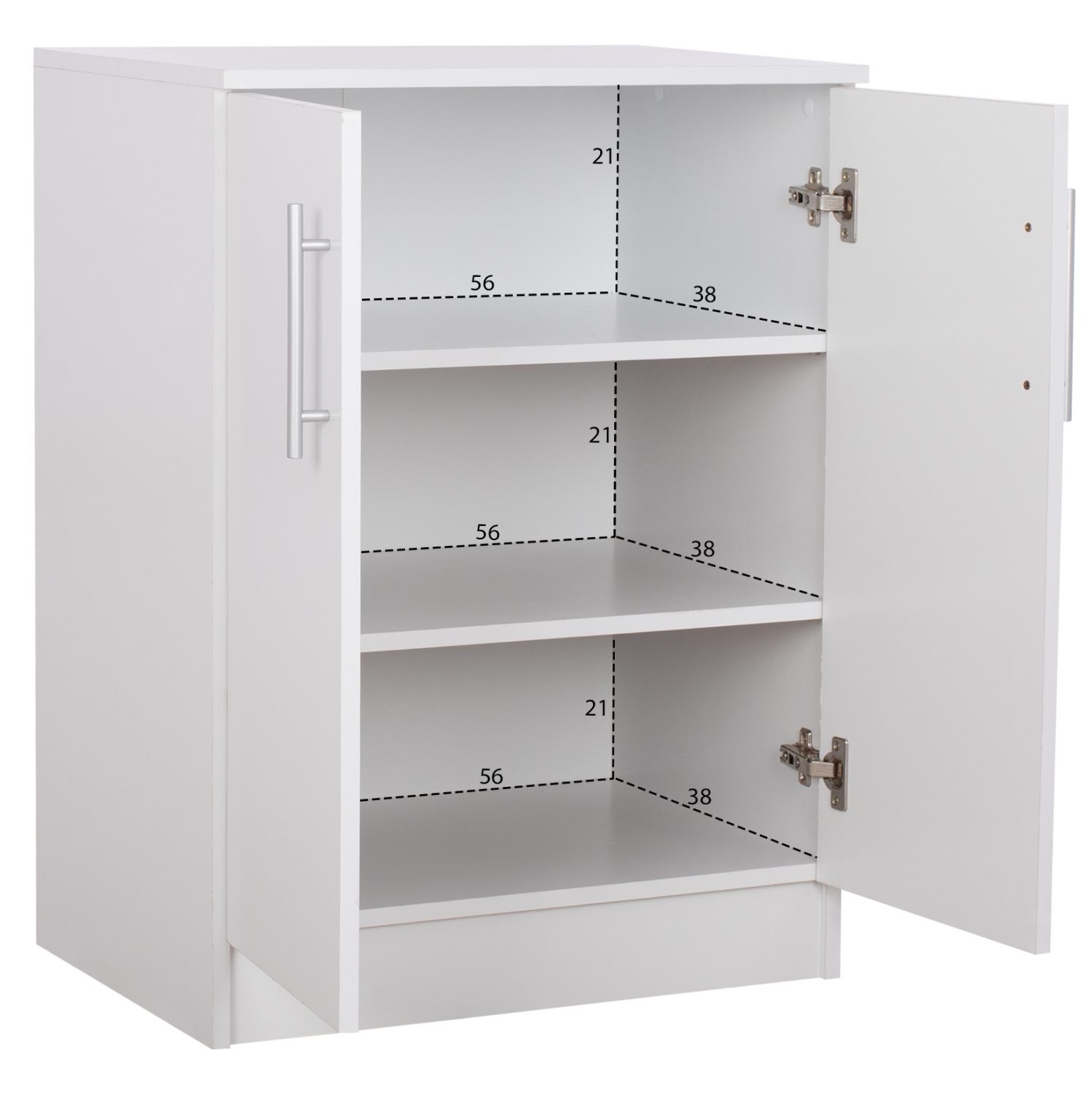 Διαθέτει δύο πόρτες και δύο εσωτερικά ράφια όπου δημιουργούν τρεις αποθηκευτικούς χώρους.