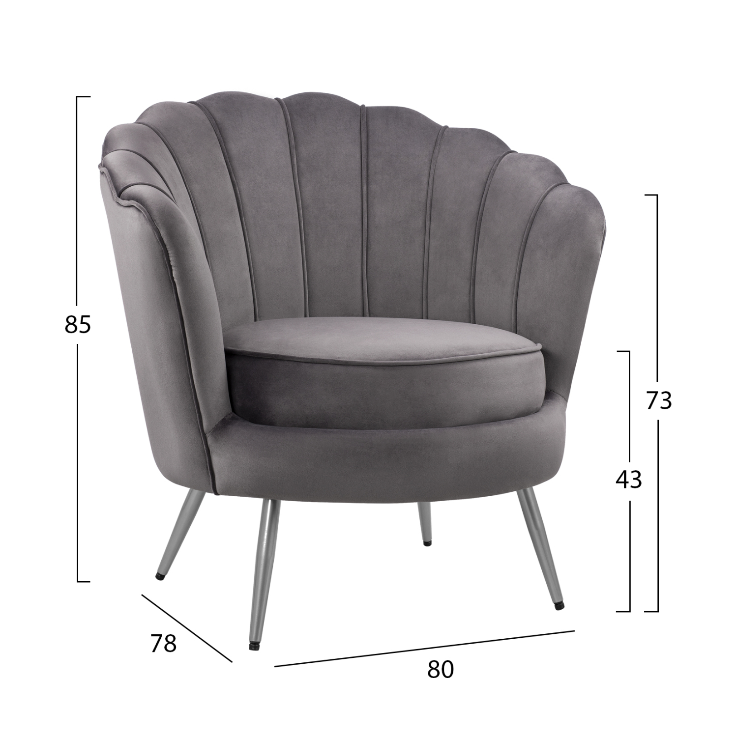 Η πολυθρόνα COQUILLE είναι ξεχωριστή! Μοντέρνα, άνετη και όμορφη! Το κυρίαρχο χρώμα είναι το ουδέτερο ΓΚΡΙ, ενώ τα 4 πόδια είναι σε ασημί χρώμα(χρωμιωμένα). Το στρογγυλό design της πολυθρόνας είναι άνετο και δίνει την εντύπωση ανοιχτού λουλουδιού με τις κάθετες καπιτονέ ραφές. Αυτό της δίνει αυτή την πολύ ιδιαίτερη όψη, ενώ η πολυθρόνα δίνει την αίσθηση ότι αγκαλιάζει το σώμα. Πρόκειται για μια πρόταση λιτή που θα ταιριάξει σχεδόν παντού!