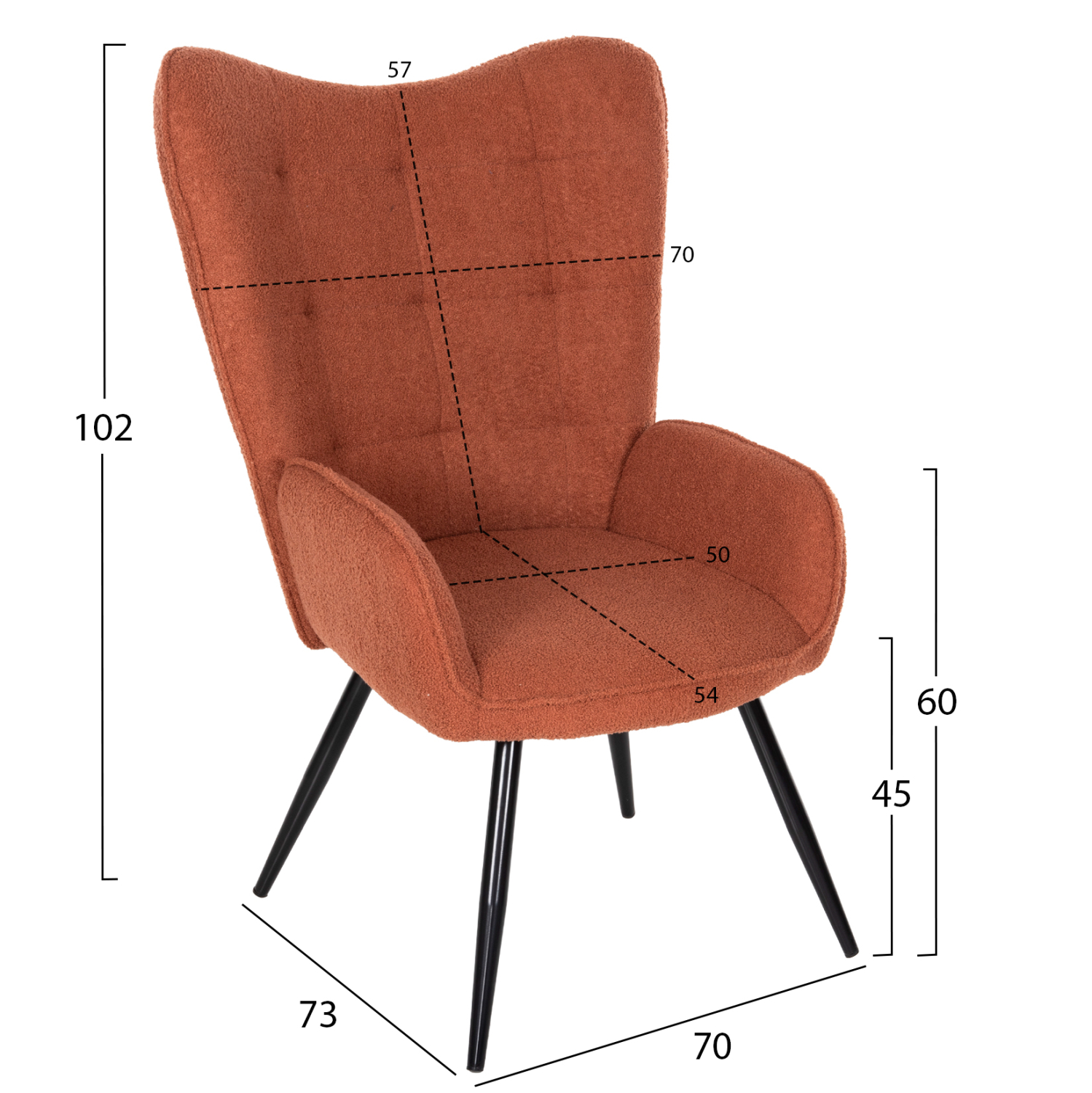 Σας παρουσιάζουμε την πολυθρόνα-μπερζέρα CRAWLEY, σε όμορφο ΠΟΡΤΟΚΑΛΙ χρώμα με μαύρα μεταλλικά πόδια. Η επένδυση της ψηλής πλάτης έχει γίνει με τεχνοτροπία καπιτονέ που προσδίδει ιδιαίτερη ομορφιά στην πολυθρόνα σε συνδυασμό, φυσικά, με το υψηλής ποιότητας μπουκλέ ύφασμα. Το κάθισμα είναι αναπαυτικό ανταποκρινόμενο στον χαρακτήρα της πολυθρόνας, ενώ το χαρακτηριστικό αυτής της πολυθρόνας είναι ότι συνοδεύεται από ένα υποπόδιο ίδιας αισθητικής. Είναι μοντέρνα συνδυάζοντας στιλ και άνεση και μπορείτε να την τοποθετήσετε δίπλα στο τζάκι, σε ένα παράθυρο ή ακόμα και στο υπνοδωμάτιό σας, και να αφεθείτε στην «αγκαλιά» της, απλώνοντας τα πόδια σας στο εξαιρετικό υποπόδιο.
