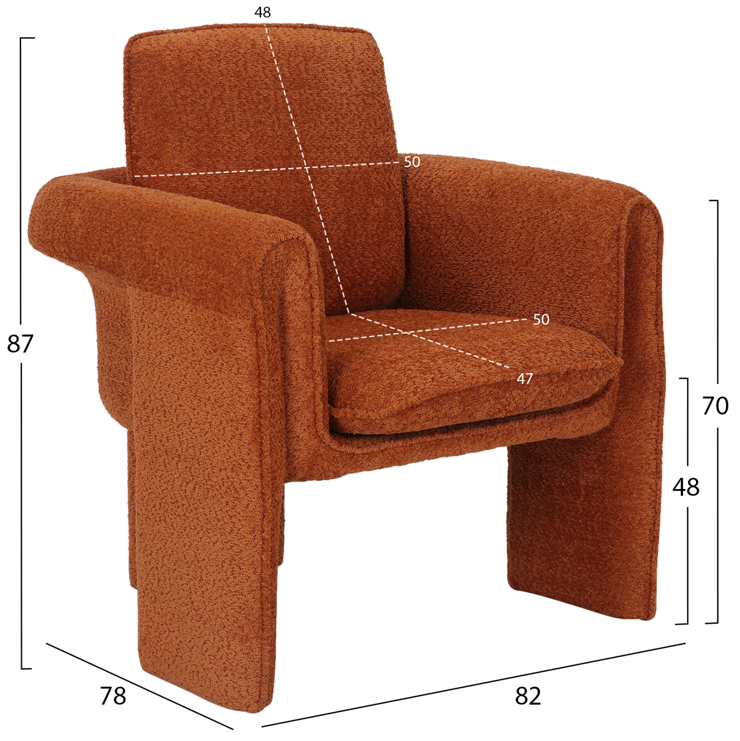 Η πολυθρόνα εσωτερικού χώρου CRUSHER σε ΠΟΡΤΟΚΑΛΙ χρώμα είναι μοντέρνα και πανέμορφη. Το χαρακτηριστικό που κάνει αυτή την πολυθρόνα να ξεχωρίζει είναι οι καμπύλες του μεταλλικού σκελετού που σχηματίζουν την πλάτη με τα μπράτσα και όλη η κατασκευή φτάνει μέχρι κάτω δημιουργώντας ουσιαστικά και τα 3 πόδια της πολυθρόνας ως φυσική συνέχεια του design. Η πλάτη και το κάθισμα διαθέτουν αναπαυτικά μαξιλάρια ολοκληρώνοντας τον μοναδικό χαρακτήρα αυτής της πολυθρόνας, που είναι σίγουρο ότι θα μαγνητίσει το ενδιαφέρον όλων.