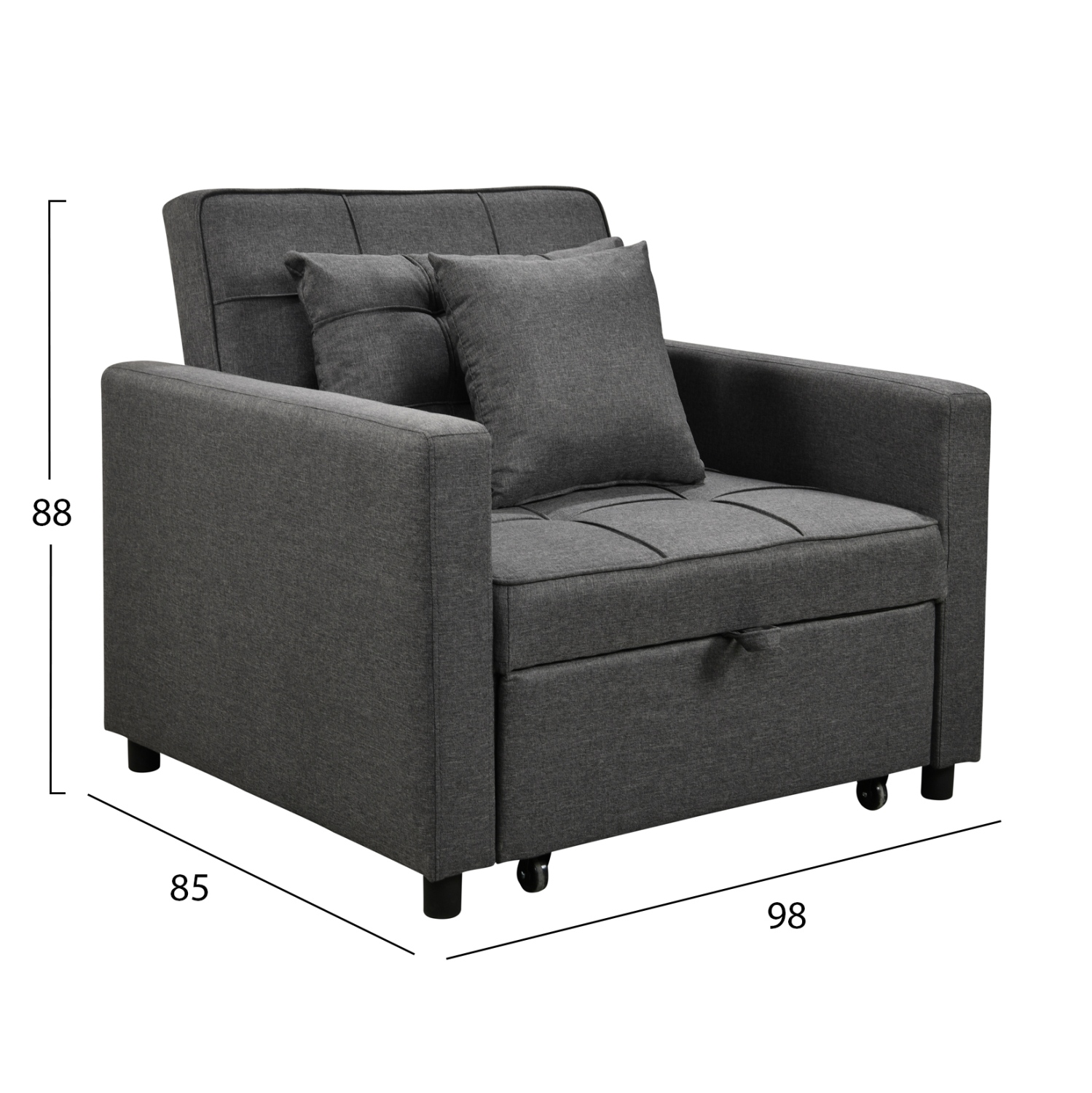 Λειτουργική πολυθρόνα-κρεβάτι με σύγχρονο σχεδιασμό, ιδανική για μικρούς χώρους και για χρήση ως καθημερινό κάθισμα ή έξτρα κρεβάτι φιλοξενίας.