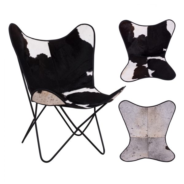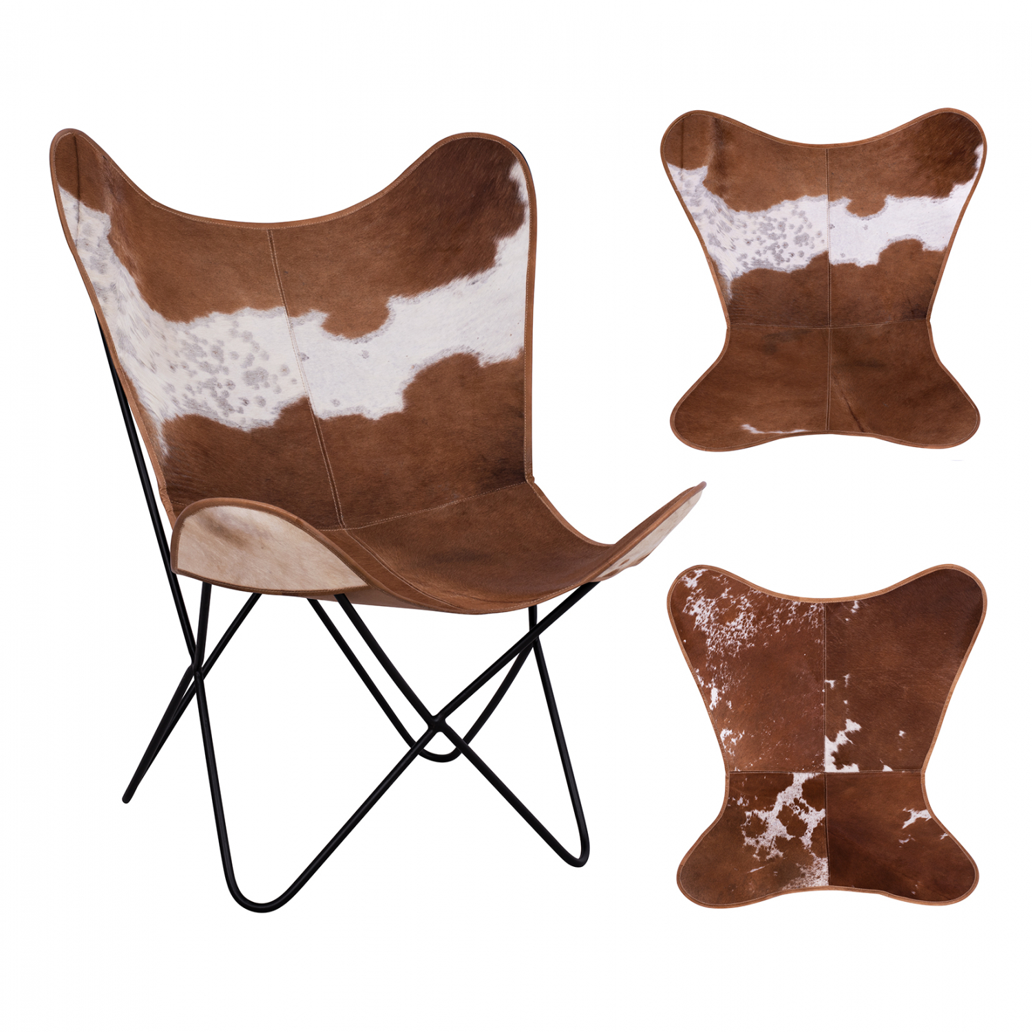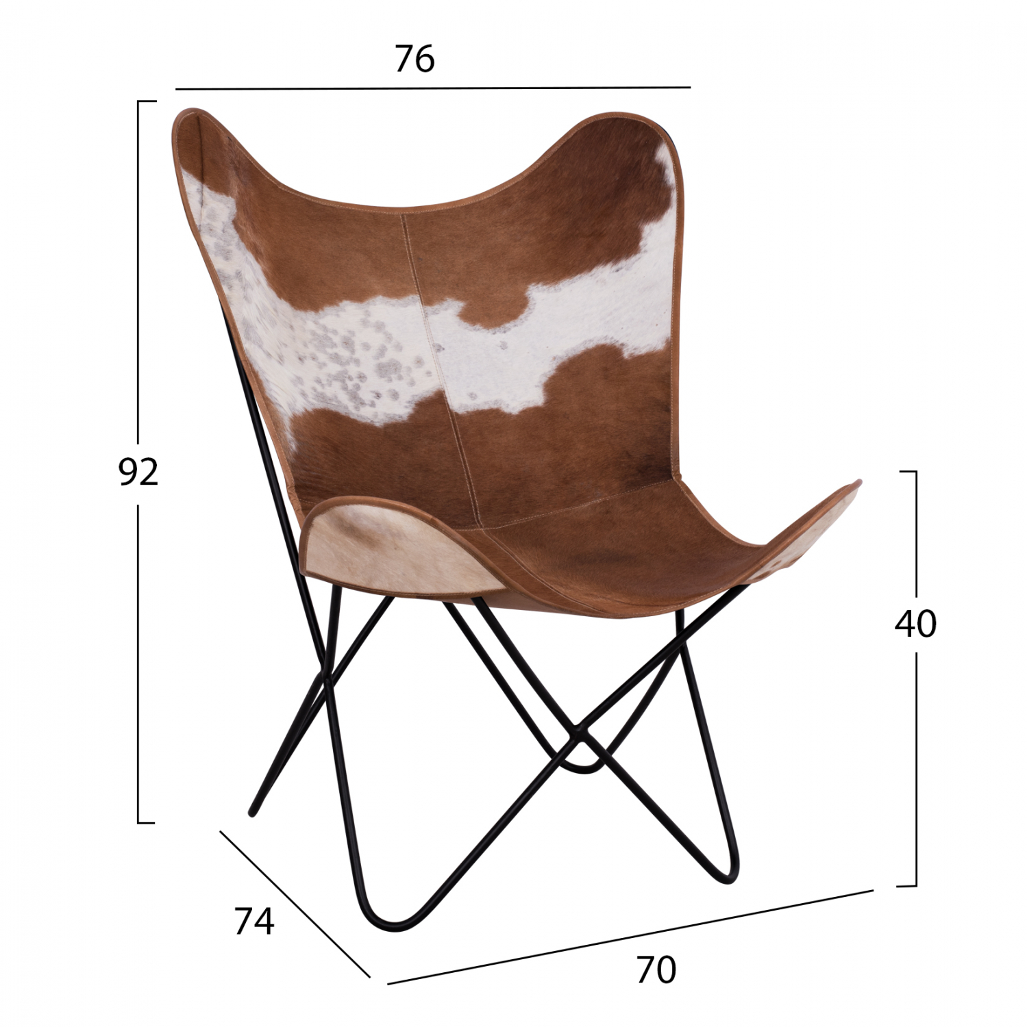 Μοντέρνα πολυθρόνα από μαύρο μεταλλικό σκελετό και γνήσιο δέρμα αγελάδος σε καφέ – λευκή απόχρωση.